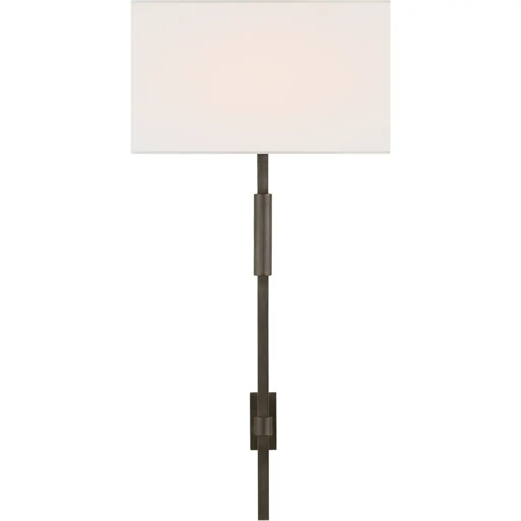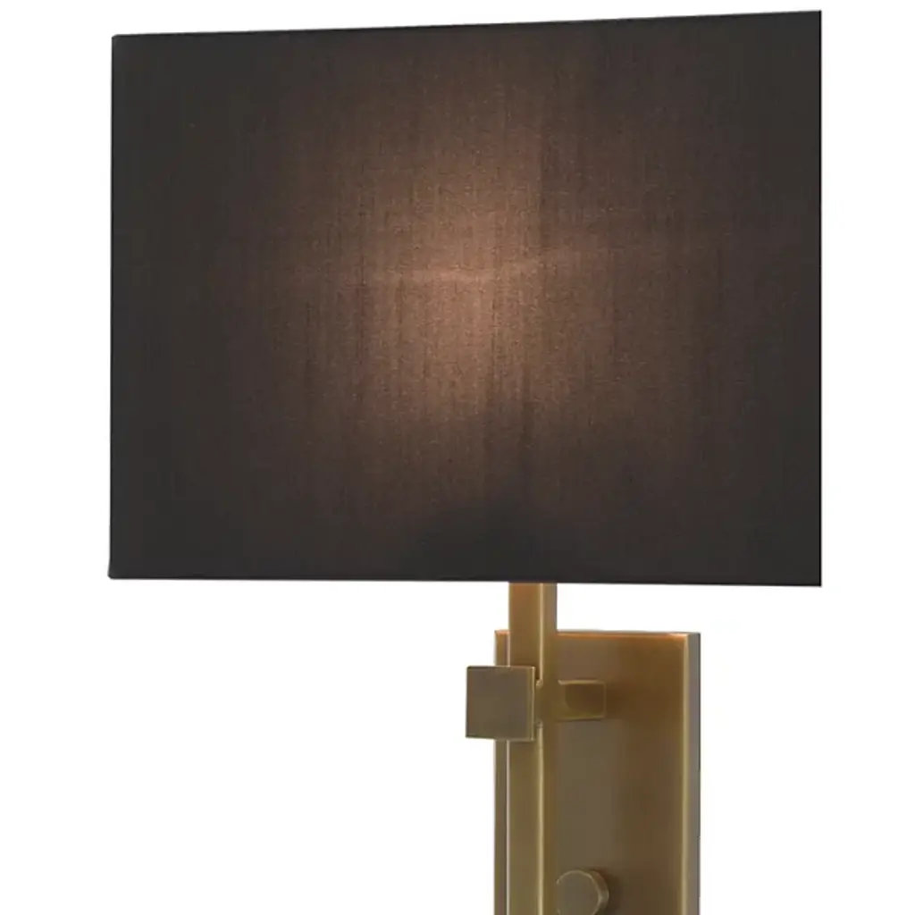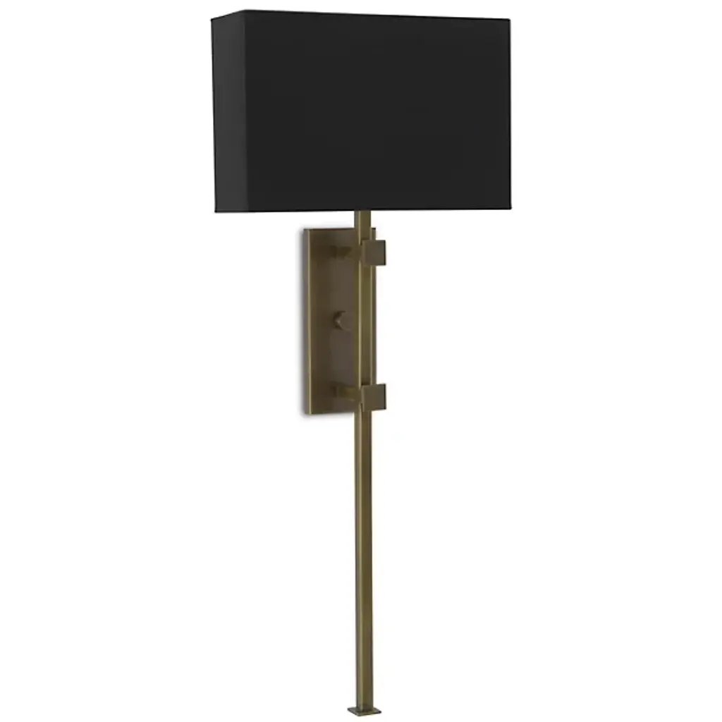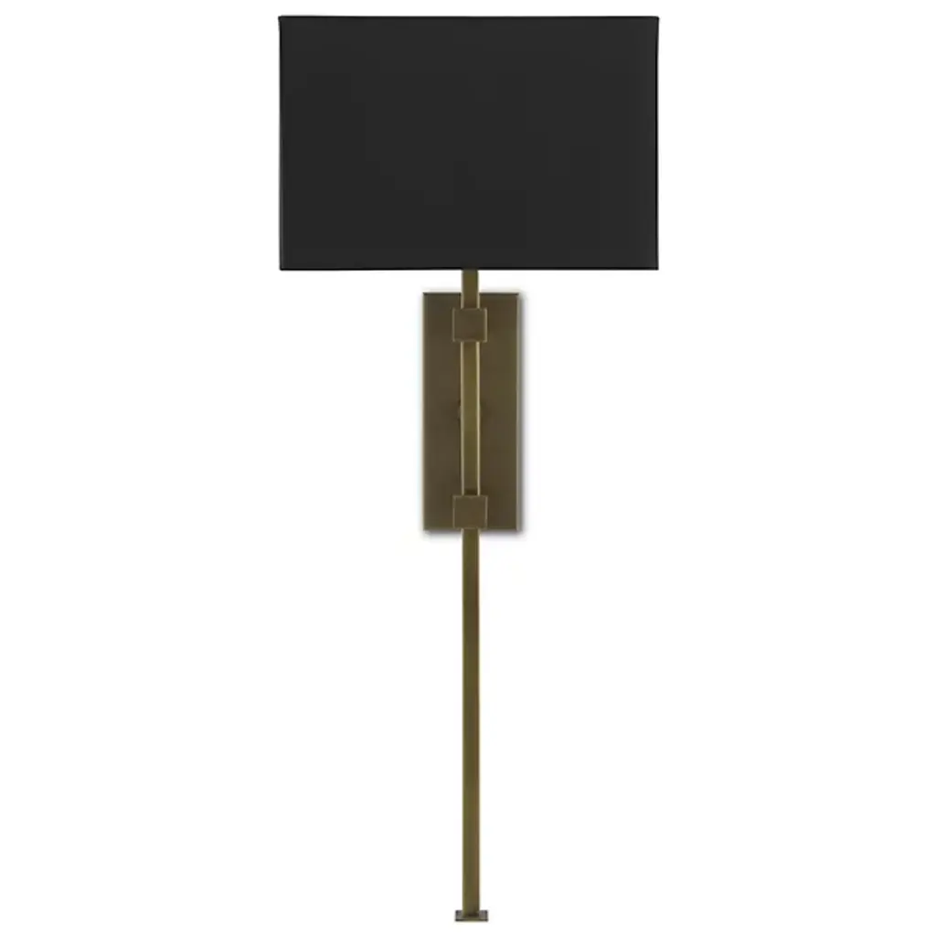 Seriously chic. The Edmund Wall Sconce by Currey & Company delivers sharp style. Featuring a pairing of a slender base with clean lines and a rectangular shantung shade, this fixture's angular shapes make it an interesting focal point for the contemporary home. Use it to bring a soft glow to both sides of a bed, fireplace mantel or contemporary sofa while elevating the look of your home décor.