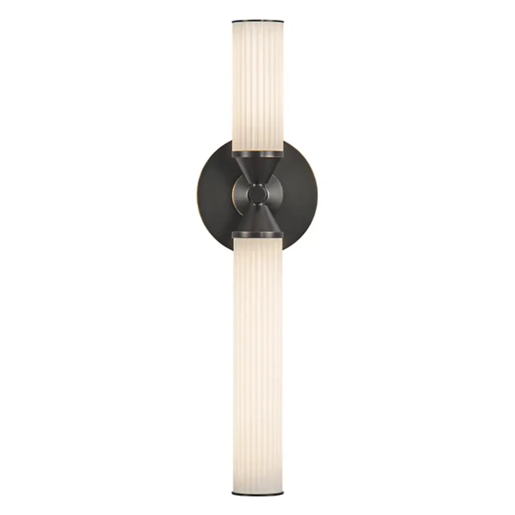 The Edwin LED Wall Sconce from Alora Lighting transports you to a glamorous bygone era of opulence. Influenced by Art Deco aesthetics and designed by Alan Pepin, its ribbed glass gracefully complements the smooth and robust steel frame, extending an hourglass housing from a circle wall mount and capturing a truly remarkable style. Integrated LED elements infuse modern elegance into vintage sensibilities, inspiring with a blend of luxury textures and classic shapes; the steel and frosted ribbed glass shades add unforgettable elegance with an ADA-compliant listing and a rating for damp environments, adding sophistication to any space while maintaining practicality and style.