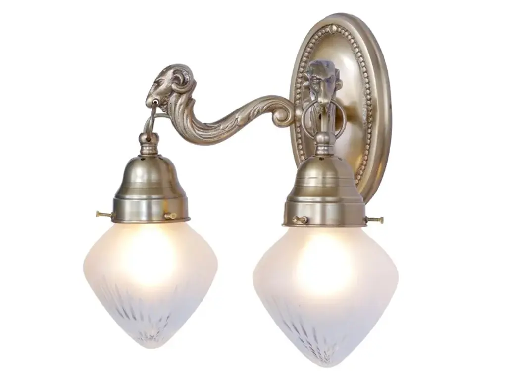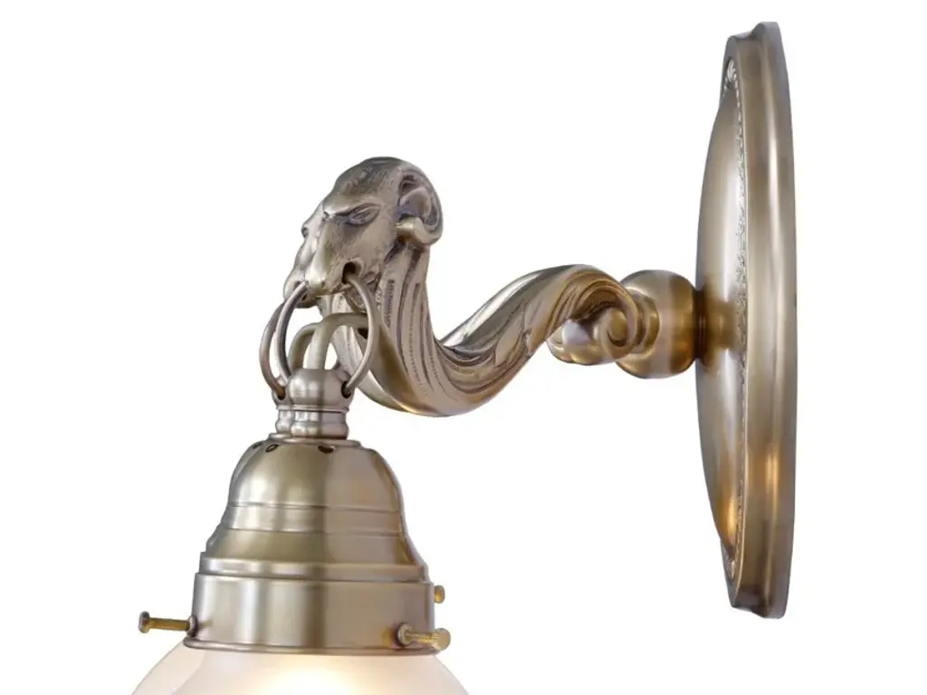 Eger III is a wall lamp made of brass available in different finishes.Finishes: Antique, Shiny brass, Matt brass, Shiny nickel, Matt nickelCapacity: 2x60 W E14Classical, but sleek, gracile, armed, neo-baroque wall light with ram head decor. The lamp was inspired by the original from the end of 1800s. Either with antique finish or gold, the wall light is a highly elegant deco of your bedroom, corridor or public hall. Should you like it even more extravagant, ask for a nickel finish. The backplate and the decorated arms are re-chiselled with greatest care with special attention to details. The lamp can be fitted with conical or round sandblasted glasses which are carved Murano style in two variations. It is 100 % Hungarian product. We produce it from pure brass in shiny, antique and nickel finishes. Its socket is porcelain one, so it can be fitted with traditional, energy saving and LED bulbs.Take some time to have a really close look at the lamp: it is, just like every lamp of ours, crafted with great care, just like a piece of jewellery. Our well-known trademark is proportionality, which took years to design and refine.In order to manufacture the lamp 14 to 16 work stages are required, depending on the finish. Handicraft technology is time consuming (some work stages take hours), it requires wide knowledge and expertise.The chandeliers of this collection have a central shade surrounded with either conical or open shades. The wall lights have matching shades, too. The graceful table lamp goes lovely with a feminin desk. The ceiling fitting of this collection has an elaborate motive of 5 rams holding a chain in their muzzle.
