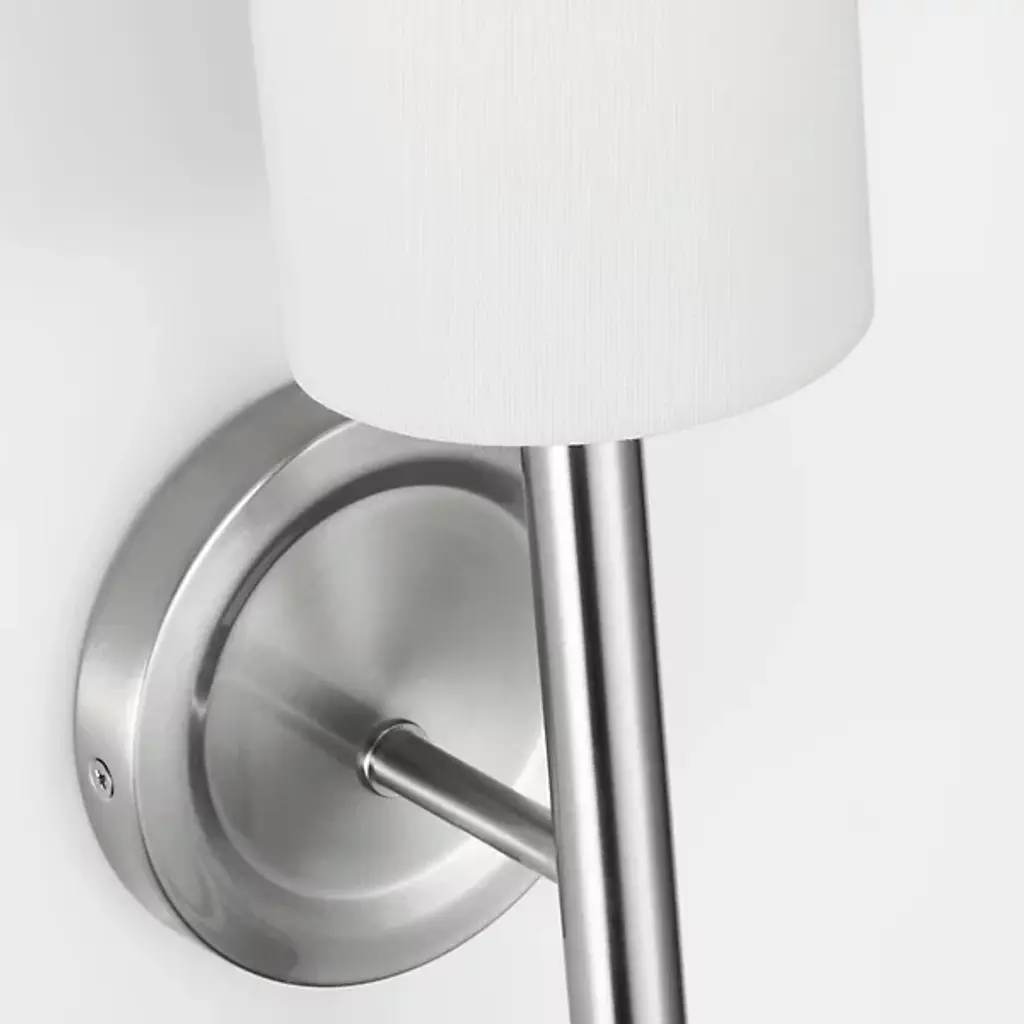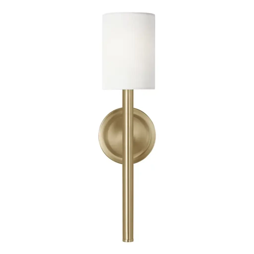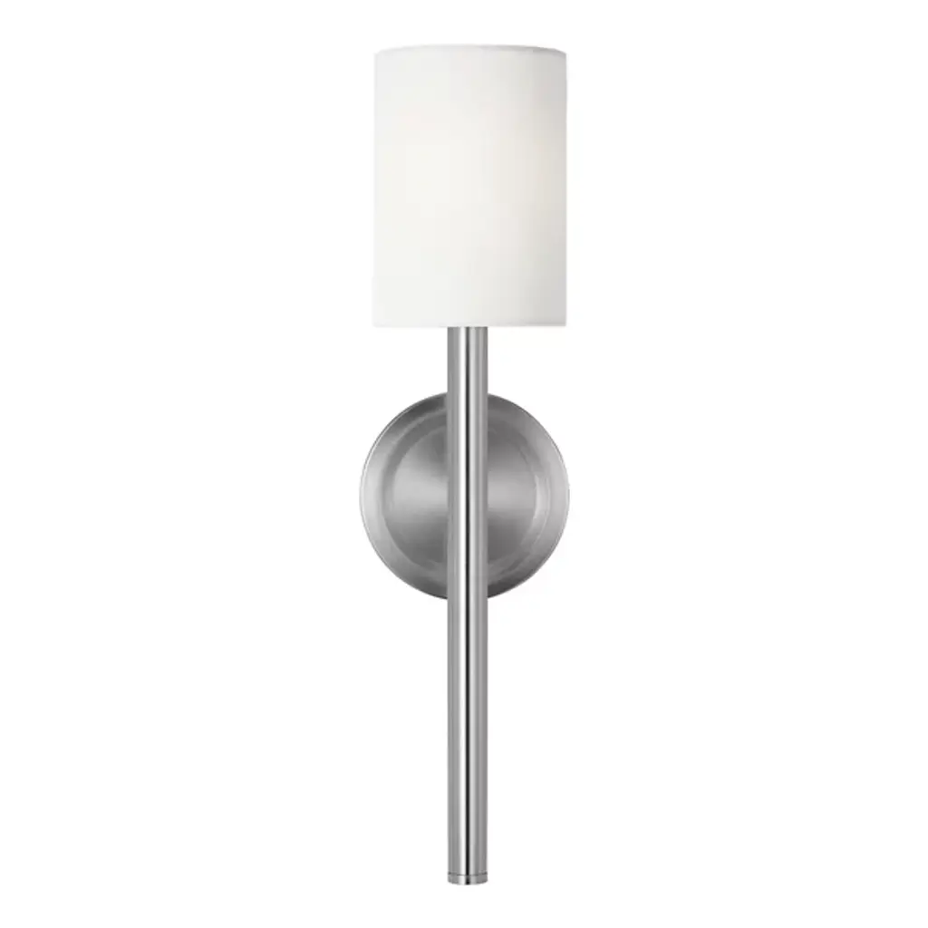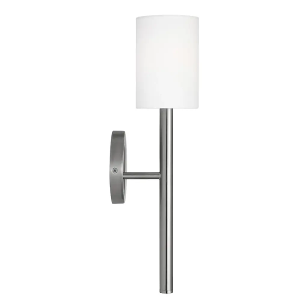 The Egmont Tall Wall Sconce from Visual Comfort Studio relies on contrasting materials to highlight indoor walls and hallways. Designed by Drew & Jonathan Scott, the transitional design sets a slender steel stem that extends from a dimpled disc wall mount, elevating damp-listed lamping inside a cylinder shade of translucent linen. The fabric texture softens the smooth steel structure beneath it, burnishing the metal body and the lamp’s surroundings with a warm, measured ambiance.