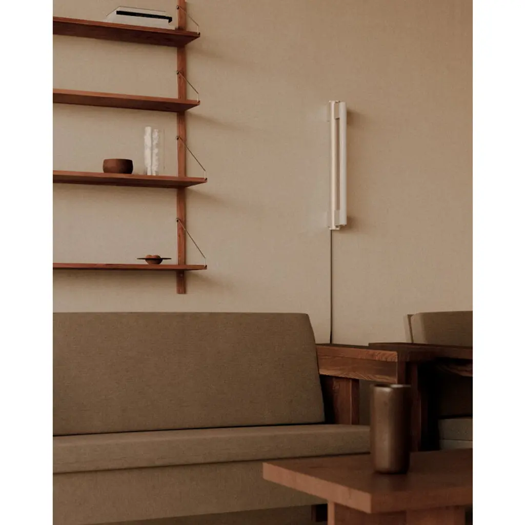 Frama's Eiffel Single is a minimalist luminaire designed by Krøyer-Sætter-Lassen in 2019, consisting of a steel frame and a tubular LED light source placed in front of it. The opal glass of the bulb filters the light softly and pleasantly, and it is also beautifully reflected from the lamp's stainless steel body. The Eiffel wall lamp is also dimmable: its light output can be adjusted by turning the round steel knob at the bottom of the luminaire. Please note that the dimmable tube bulb (Osram LED bulb 50 cm) is sold separately – you can add it to your cart in the accessories section below.