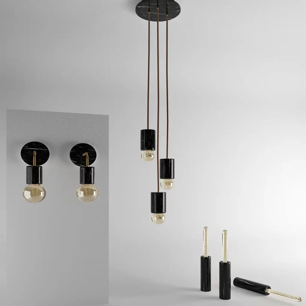Smart solution to be displayed in multiples to illuminate hallways or living rooms, this fine sconce exemplifies the effortless elegance of marble enhanced by sleek geometric volumes. Both the circular wall mount and the cylindrical bulb holder are crafted of black Marquina marble in a refined matte finish, linked by means of a dainty, curved satin brass tube. Available in multiple marble options, the design fits E27 bulbs.
