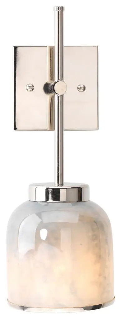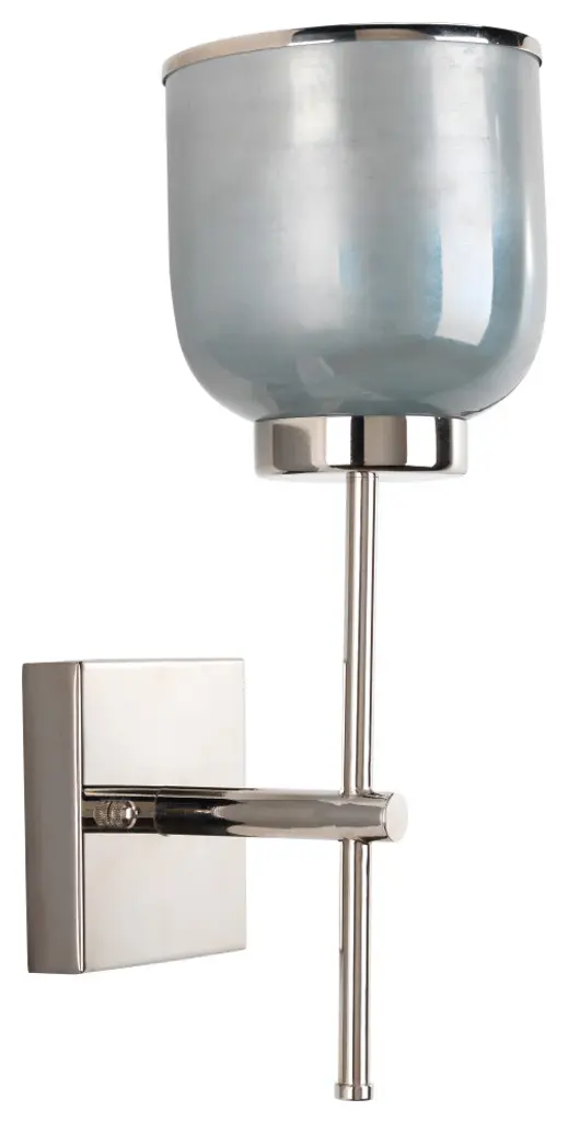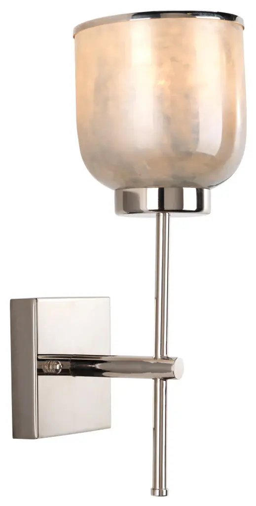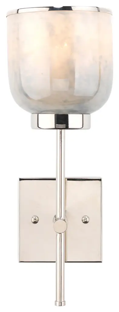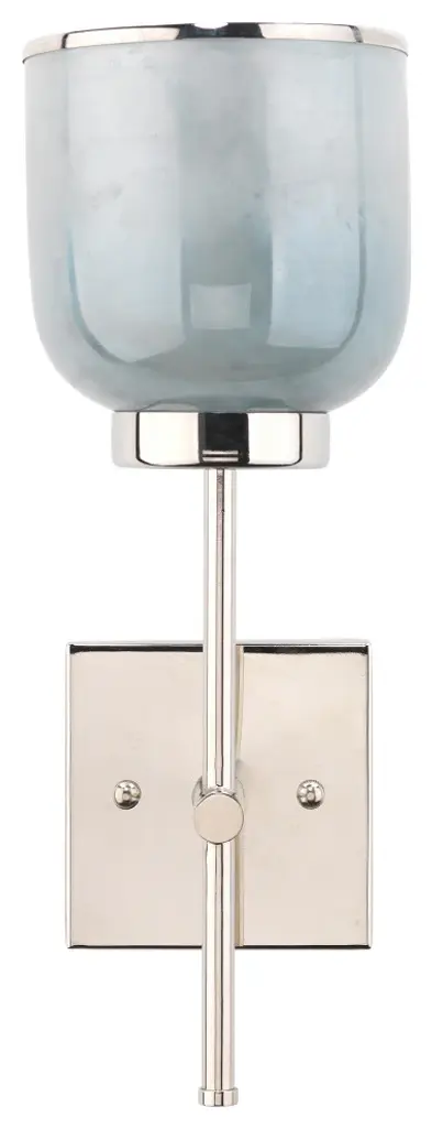 This stunning sconce was inspired by soft fog, glimmering in the afternoon sun, creating a beautiful finish on these incredible pieces. Use this as an upward or downward facing sconce to highlight the incredible ombre effect it creates when the sconce is illuminated. The hand blown glass will be different on every piece. It''s a beautiful alternative to a vanity light in a bathroom, or an elegant way to light a column in a living area. Available in two finishes, and as a double sconce, chandelier, or pendant.• 15.75"H x 5.5"W x 7" deep. Weighs 7 lbs.• Hand Finished Iron and Art Glass• UL Listed. Uses 1 max 40W Type B Candelabra bulb (not included). Hard wired.• Heirloom Quality - Expertly hand crafted and hand finished. Due to the hand crafted nature of this piece, each piece may have subtle differences.