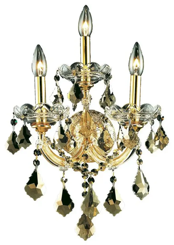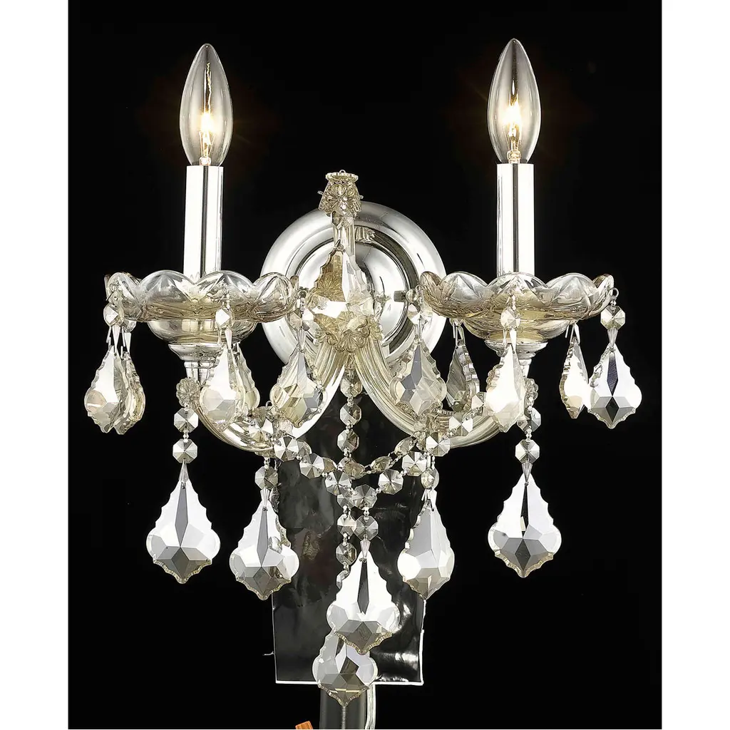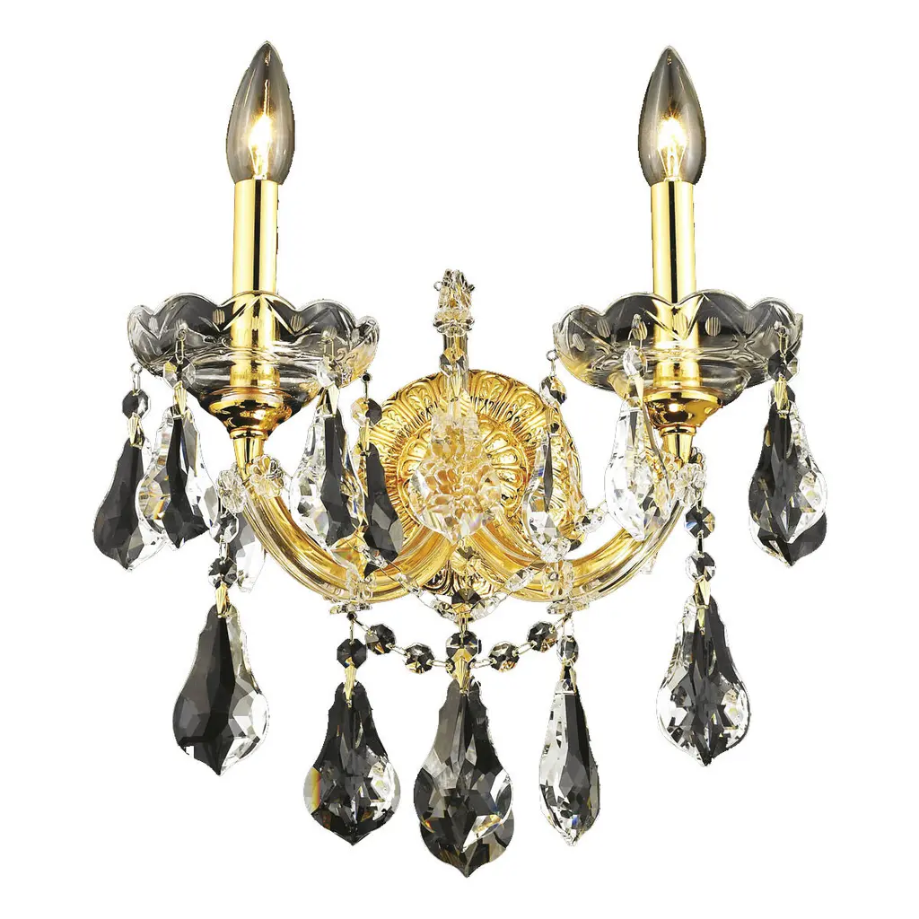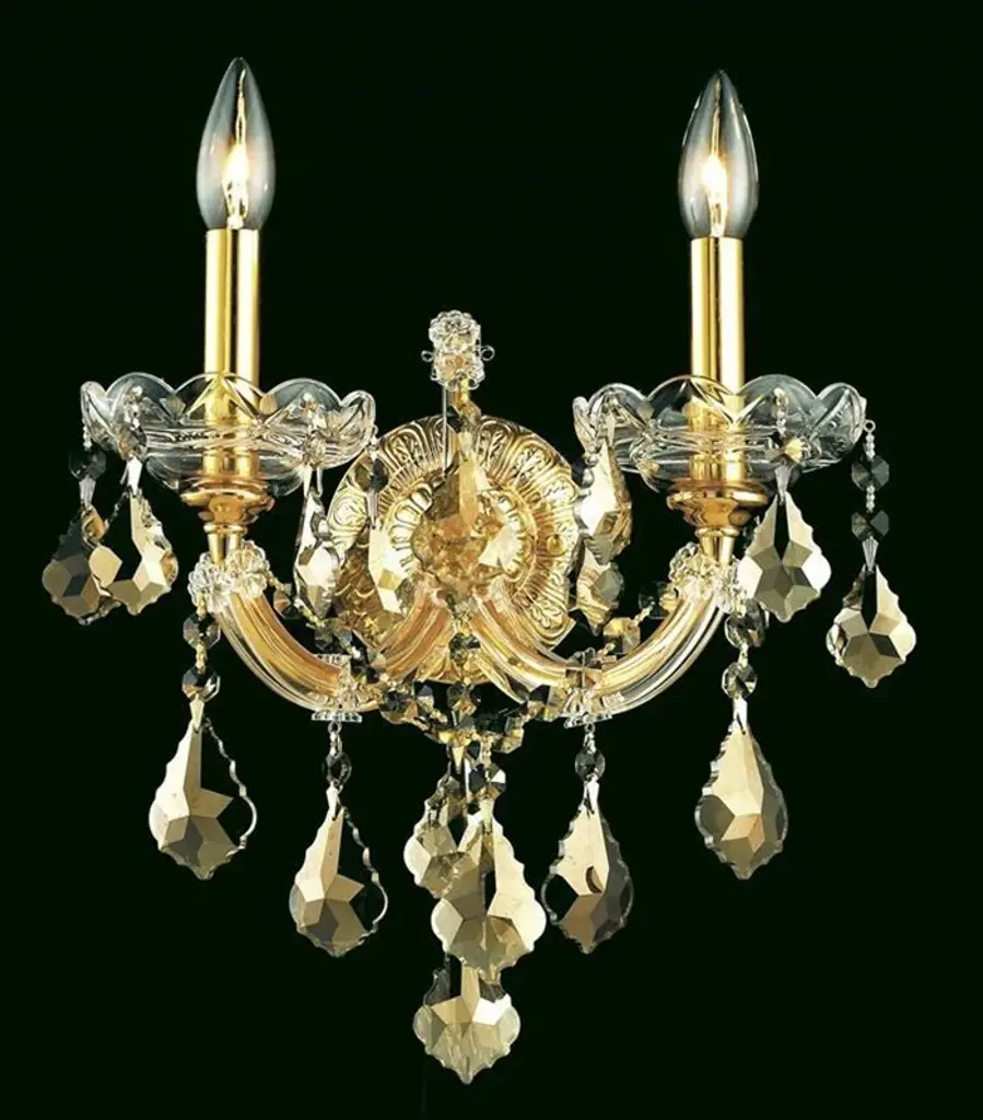 Bring the beauty and passion of the Palace of Versailles into your home with this ageless classic. The Maria Theresa has been the gold standard for elegance and grace in the chandelier world for hundreds of years. The Maria Theresa has delicate glass arms draped with plentiful amounts of classic clear crystal or the wildly popular golden teak crystal and is guaranteed to make your home feel like a palace. Illumination- Bulb Type: E12- Number of bulbs (not included): 2- Max Wattage: 120Style- Finish: Gold- Collection: Maria Theresa- Chain/Wire Included: 10"- Crystal Color: Golden Teak (Smoky)- Crystal Trim: Royal CutAdditional Info- UL & Ulc rated- Voltage: 110V-125VCrystal Trim Details: Royal Cut Crystal: a combination of high quality lead free machine cut and machine polished crystals & full-lead machine-cut crystals to meet a desirable showmanship of an authentic crystal chandelier. Elegant Cut Crystal: Elegant Cut Crystal consist 30% of high quality full-lead machine-cut crystal that is above industry standards. It possesses sharp faceting polished to a visual radiance. It is more faceted than Royal Cut. Spectra Crystal: reliable crystal quality by SWAROVSKI Swarovski Elements Crystal: Formerly branded as Swarovski Strass. An exercise in technical perfection, Swarovski ELEMENTS crystal meets all standards of perfection. It is original, flawless and brilliant, possessing lead oxide in excess of 33%. Made in Austria, each facet is perfectly cut and polished by machine to maintain optical purity and consistency. An invisible coating is applied at the end of the process to make the crystal easier to clean.