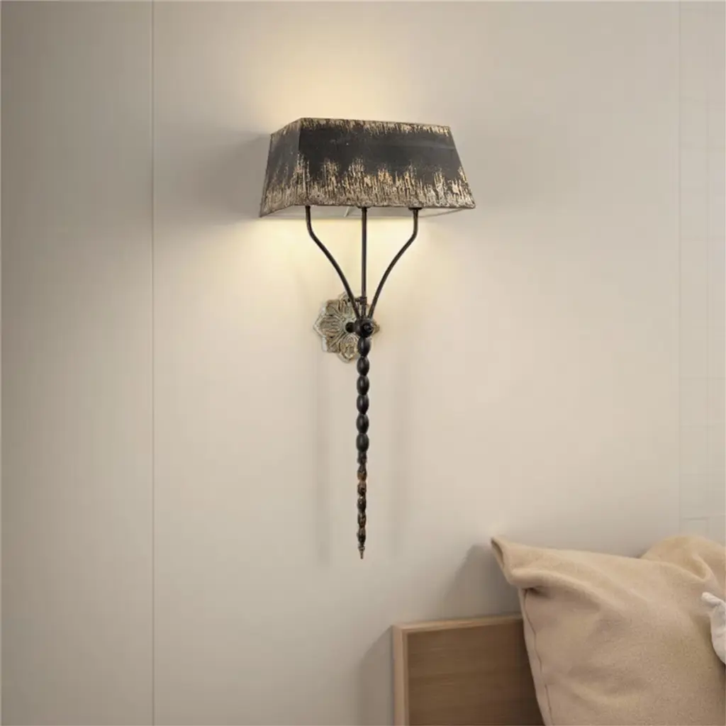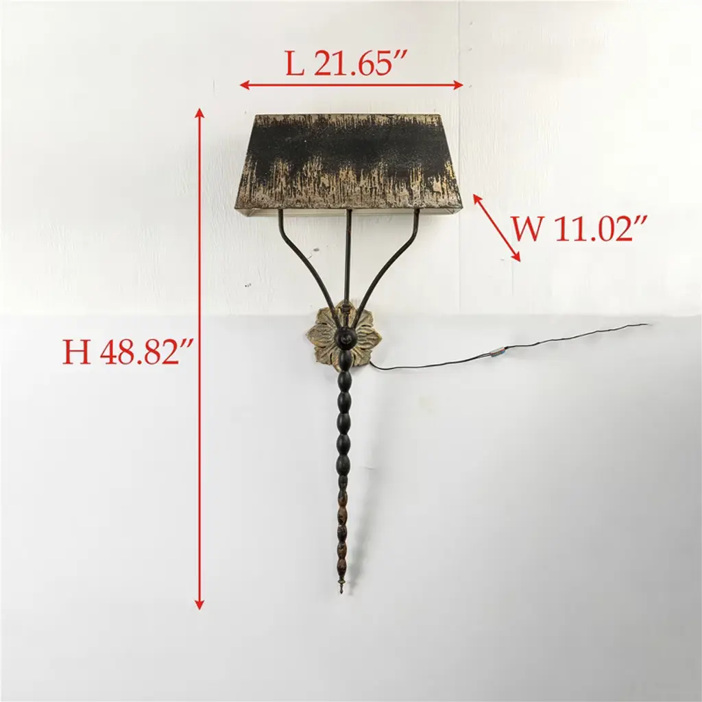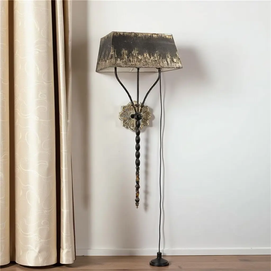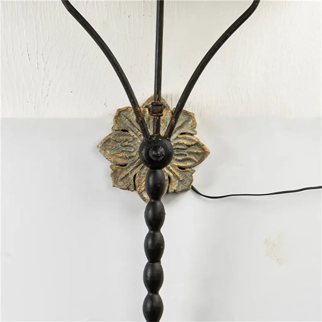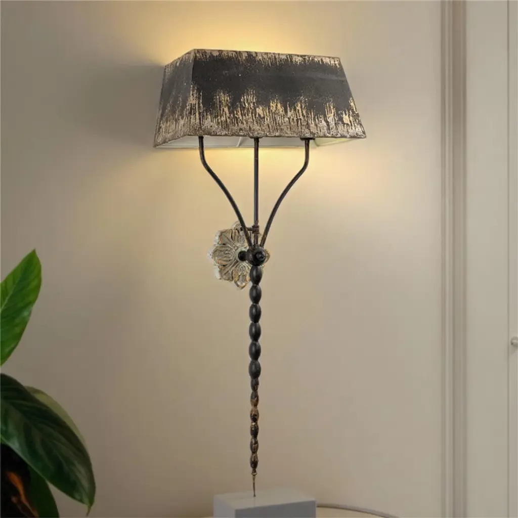 This elegant wall sconce exudes vintage charm with its distinctive design. It features a beautifully shaped black shade, highlighted by a distressed gold interior that adds warmth when illuminated. The sconce is anchored by an ornate wall mount with floral detailing, while the body consists of a slender, beaded stem that flows gracefully downwards. The combination of rich textures and colors makes this piece a striking addition to hallways or living spaces, enhancing the ambiance with its classic sophistication. #wall light #wall sconces #night light #Shabby Chic #Shabby Chic Light #unique gift lamp #wall sconces modern #wall sconces lights #wall decor #home decor