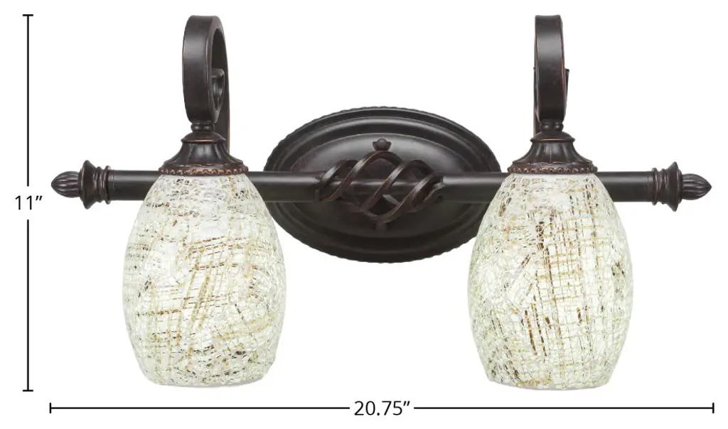 Transform your space with the sleek Elegante 2-Light Bath Bar. Installation is a breeze - simply connect it to a 120 volt power supply and enjoy. Achieve the perfect ambiance with its dimmable lighting feature (dimmer not included). This energy-efficient light is LED compatible, adding convenience to your lighting choices. Suitable for use with standard medium base bulbs, enjoy easy and seamless set up. Cleaning is a breeze, just use a damp cloth and do not use chemical cleaners. With its streamlined hardwired design, rest assured that this product is made to last. It''s suitable for damp locations and boasts a durable glass shade that ensures even light diffusion. Explore the range of finish, color, and glass size options to find the perfect match for your space.Features:• Easy to install and use with 120 volt power supply• Create the perfect ambiance with dimmable lighting (dimmer not included)• Energy-efficient and LED compatible for long-lasting illumination• Versatile lighting options with compatibility for standard medium base bulbs• Easily maintain cleanliness with a damp cloth, do not use chemical cleaners• Streamlined installation and seamless integration with hardwired design• Safely rated for damp location useDimensions:Bath Bar Light• Assembled Product: 21.25 inches wide x 9 inches deep x 8.75 inches high• Shade Width: 7 inches• Wire Length: 15 inchesRequirements:• Bulb Base: E26• Bulb Type: LED Bulb, IncandescentFor over 40 years, Toltec Lighting has been dedicated to creating extraordinary lighting experiences for our customers. Our extensive online catalogue showcases a diverse range of contemporary and timeless collections, offering over 40 glass shade choices to personalize each fixture to your unique taste. Whether you seek traditional, transitional, or contemporary styles, our fixtures effortlessly complement any decor. With an unwavering commitment to quality, value, and exceptional service, we prioritize your satisfaction by ensuring hassle-free transactions. Toltec Lighting stands proudly as a beacon of reliability and brilliance, and we look forward to illuminating your home for years to come.