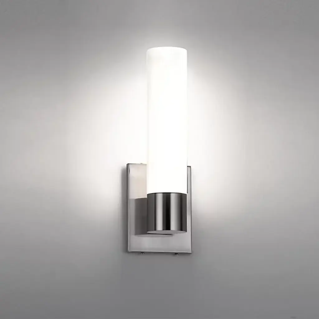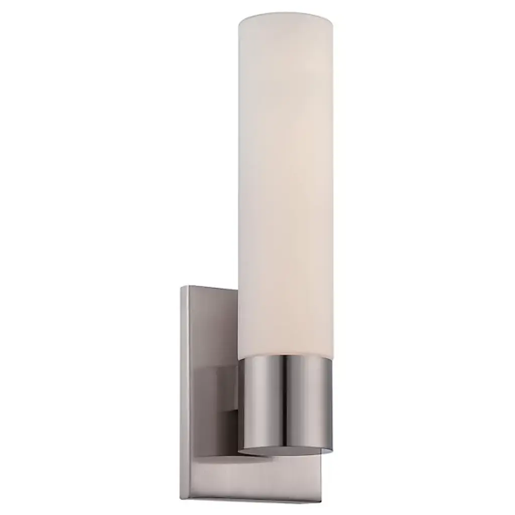 The Elementum LED Bathroom Wall Sconce by dweLED offers a simple design for any contemporary space. A rectangular aluminum backplate supports the fixture, with a sleek, cylindrical base holding the tubular shade. Constructed from mouth-blown etched glass, the shade evenly diffuses its integrated LED technology to emit a warm and soft light. Its simple design makes it a perfect addition to any décor, as it can elevate a space or seamlessly blend in.