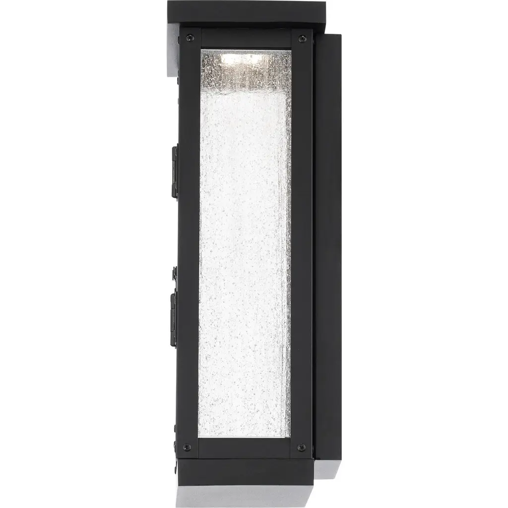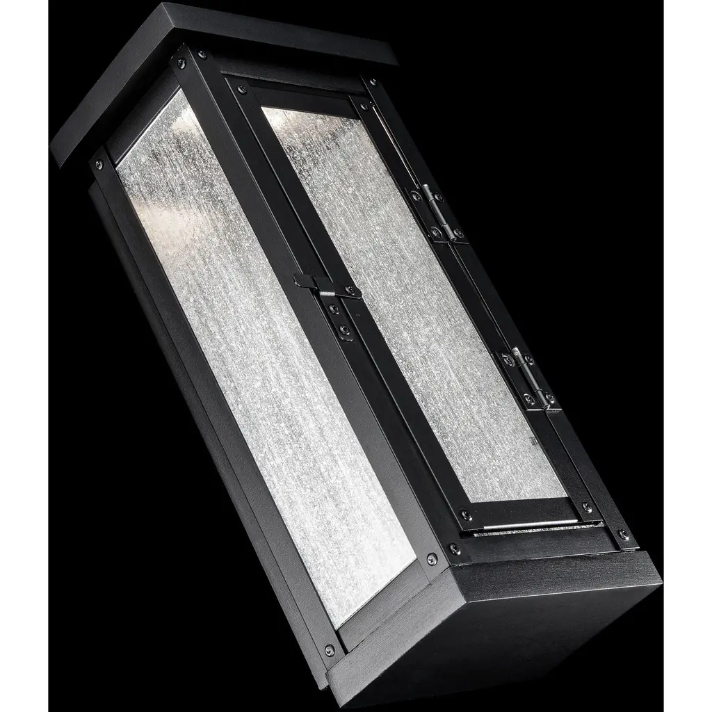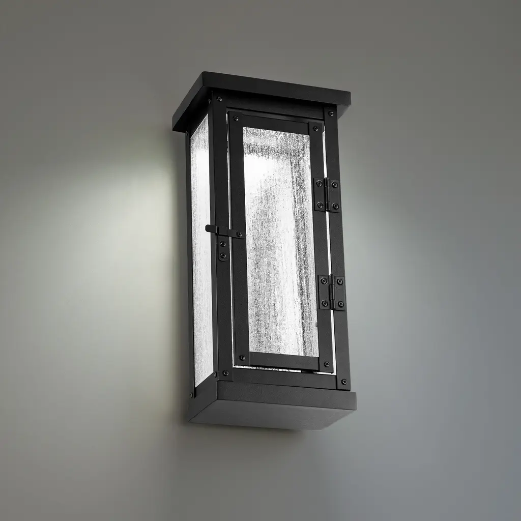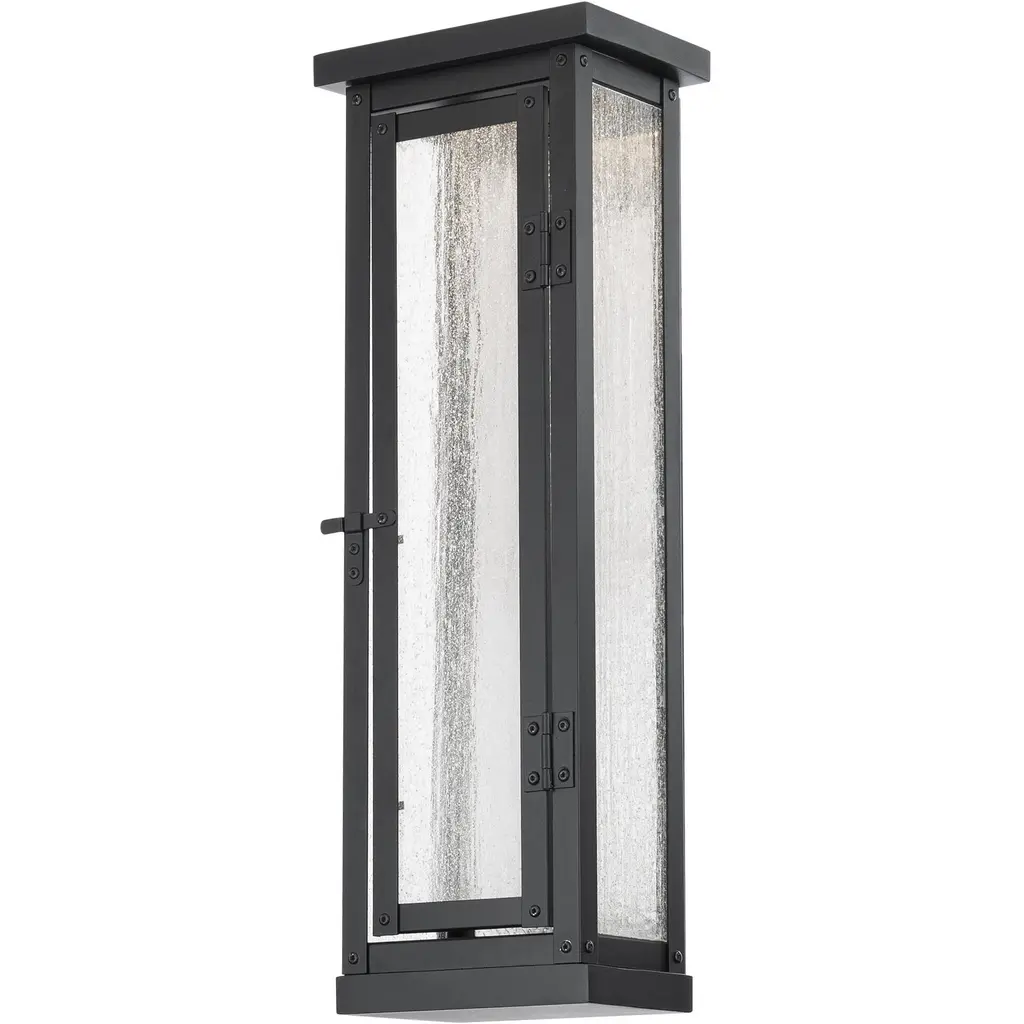 Reinvented tradition with an elevated aesthetic, resonating with a traditional design but created using modern artisan techniques. The Eliot outdoor wall sconce offers a downlight element that is refracted off of a textured metal backplate through clear seedy glass for a sparkling and uniquely traditional effect. The hinged door serves as a charming early electric aesthetic as well as access for easy cleaning and maintenance. Wrapped in a modern weather resistant black finish, Eliot is available in a 14in and 20in version. Energy efficient integrated LED's provide a long-lasting maintenance-free bright and even illumination.