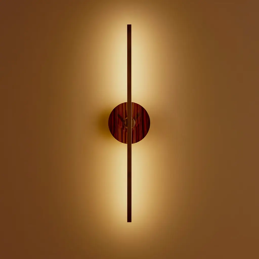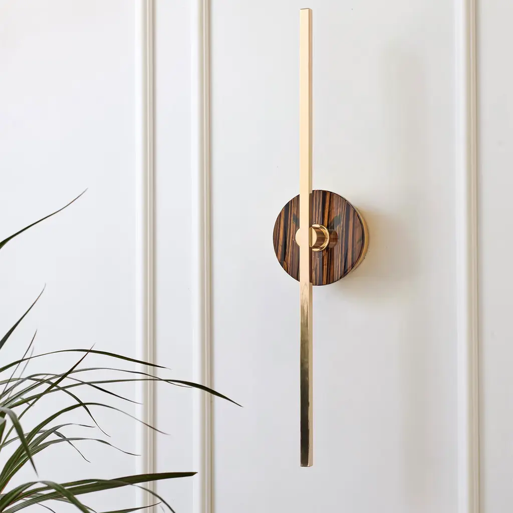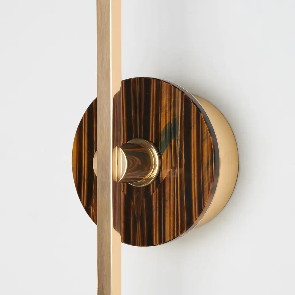 The Elite Stick Wall Sconce harmoniously merges sleek minimalism with modern functionality. Featuring slender polished brass profiles, it elegantly showcases the warmth and diffusion of LED technology, providing a cozy illumination. The tiger Eye serves as a striking decorative element, introducing a vibrant pop of color and a sense of solidity to the design. Each piece is handmade in Italy, ensuring a unique craftsmanship that enhances any contemporary space.