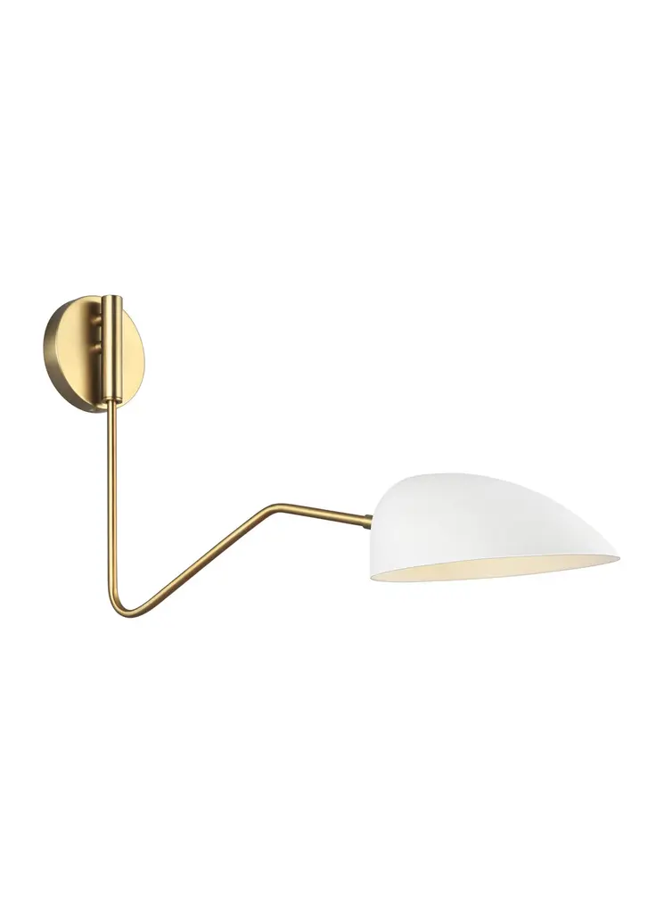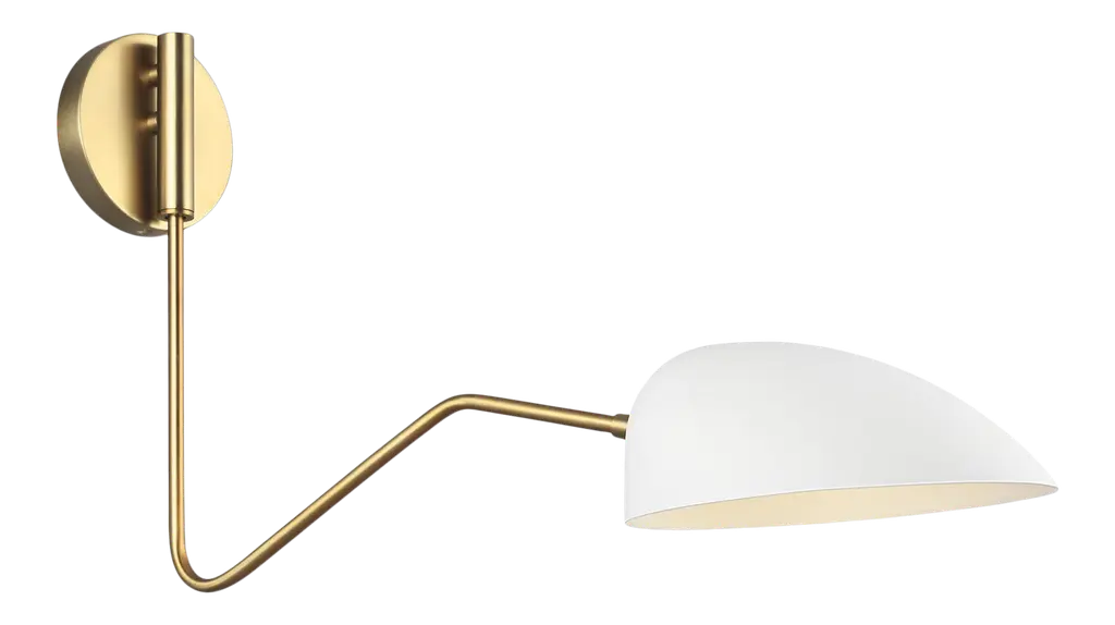 The Jane one light swing arm lamp in matte white offers shadow-free lighting in your powder room, spa, or master bath room. The retro-inspired Jane collection features a luxe two-tone finish of Burnished Brass with Midnight Black or Matte White accents. Adjustable shades on Jane chandeliers enable illumination that perfectly suits your space. Elongated arms and soft curves add dimension and drama to each fixture. Designer: Ellen DeGeneres Extension: 24 1/8 Backplate: D:4 3/4'' DP:3/4'' OB UP:2 3/8'' Round Shade/Glass: matte white steel shade Lamping: 1 G16-1/2 Candelabra 60 watt light bulb Voltage: 120 Bulb Included: No Safety Rating Location: dry