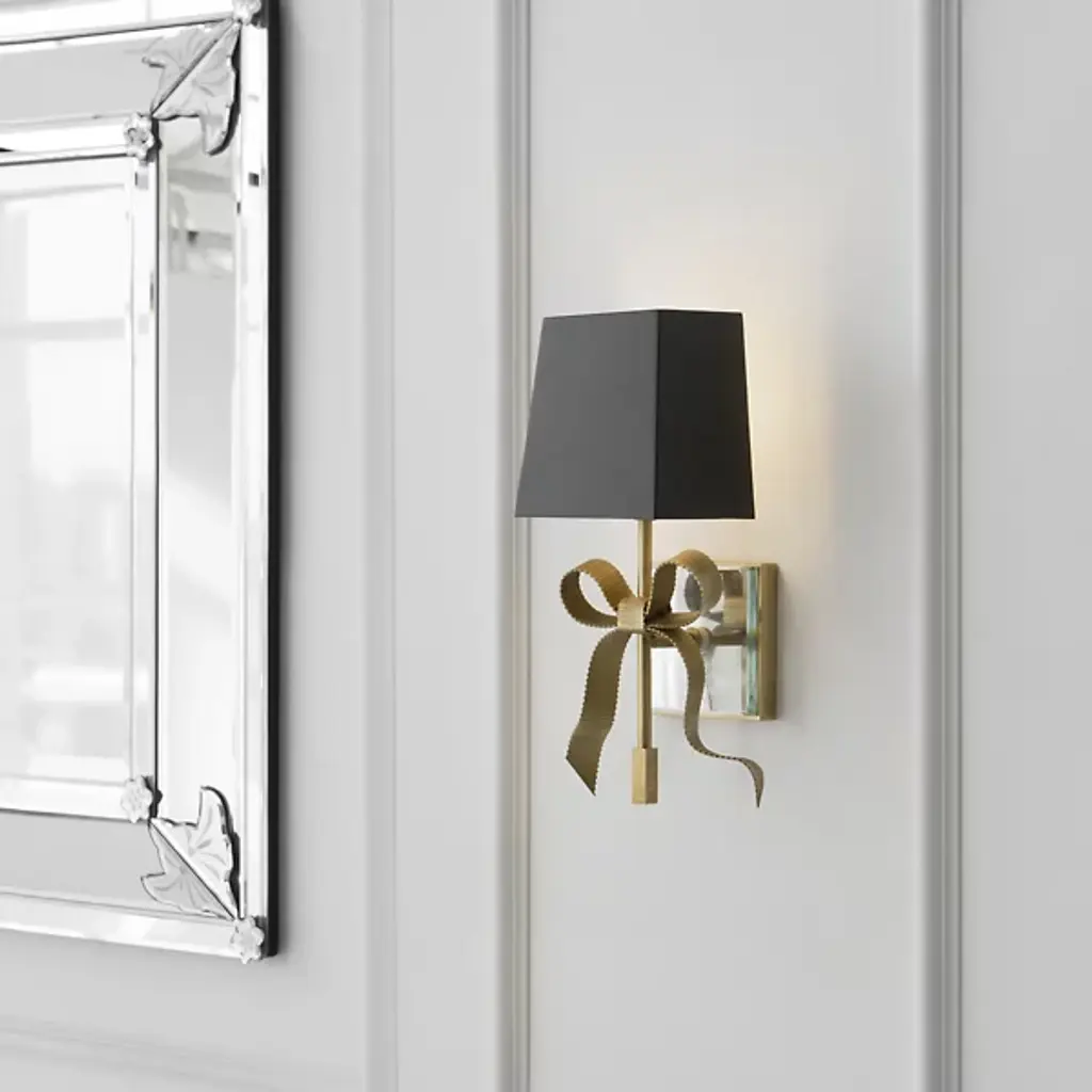 The Ellery Bow Wall Sconce by Visual Comfort Signature, formerly known as Visual Comfort, provides a handsome, decorative feel to your home décor, featuring a sleek, shaded lamp that’s been tied off with a Grosgrain bow. A tapered Linen shade provides diffusion for an internal light source, working in conjunction with the fixture’s reflective finish and mirrored wallplate for a dynamic, glistening ambiance.