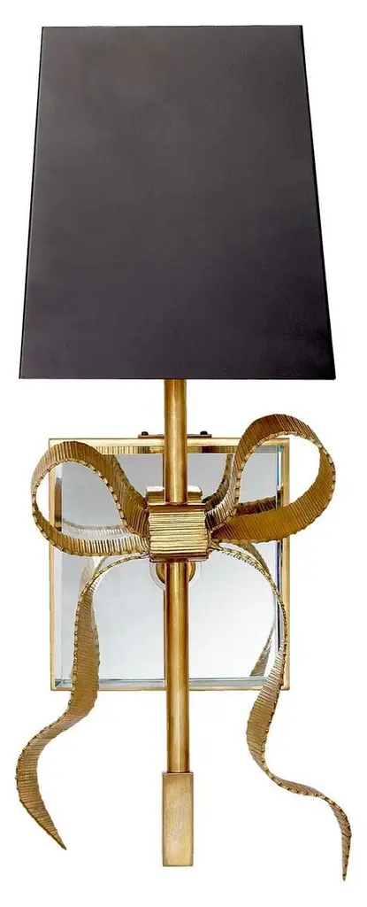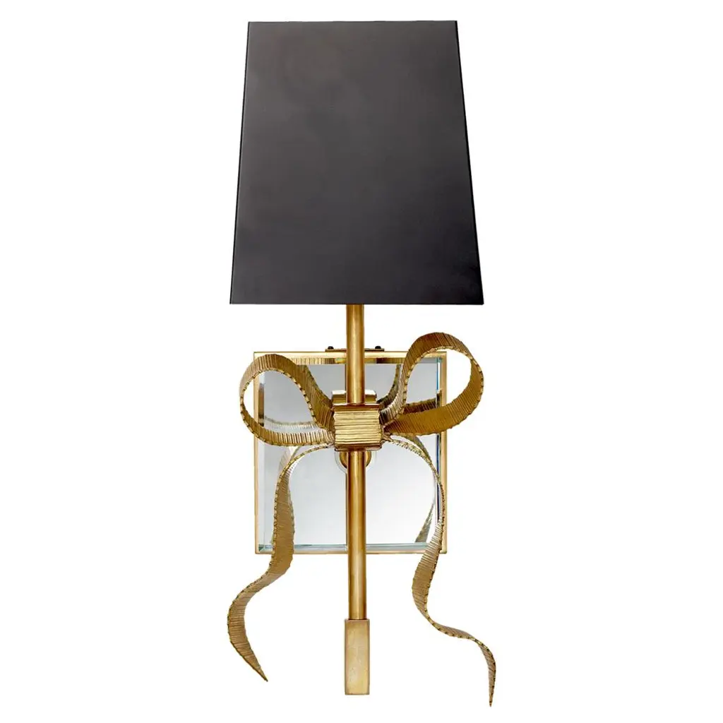 The Ellery Bow Wall Sconce by Visual Comfort Signature, formerly known as Visual Comfort, provides a handsome, decorative feel to your home décor, featuring a sleek, shaded lamp that’s been tied off with a Grosgrain bow. A tapered Linen shade provides diffusion for an internal light source, working in conjunction with the fixture’s reflective finish and mirrored wallplate for a dynamic, glistening ambiance.