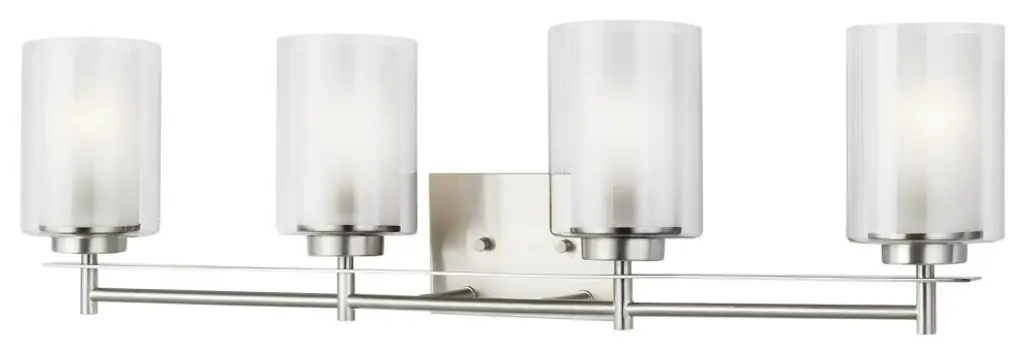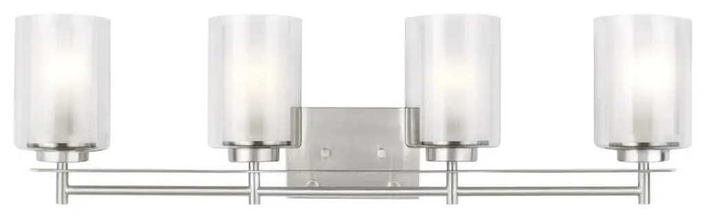 The Generation Lighting Lighting Elmwood Park four light vanity fixture in brushed nickel is an ENERGY STAR qualified lighting fixture that uses fluorescent bulbs to save you both time and money. Elmwood Park by Generation Lighting Collection has clear glass tube shades with an inner white glass element that softens the light and helps cast an even glow. A cylinder of etched glass is centered within a larger cylinder of clear glass which encircles each light bulb to create this stunning visual effect. The full assortment includes three-, five-and nine-light chandeliers, a four-light linear, one-light mini pendant, a three-light pendant, a two-light semi flush which is convertible into a pendant, and one-, two-, three- and four-light bath fixtures. All fixtures offered in either a Brushed Nickel or Brushed Oil Rubbed Bronze. Incandescent and ENERGY STAR-qualified LED lamping are available; all fixtures are California Title 24 compliant.Lighting Information:Bulb type: 4 A19 Medium 9.3 watt light bulbsNumber of bulbs: 4Bulb(s) includedcETL Listed