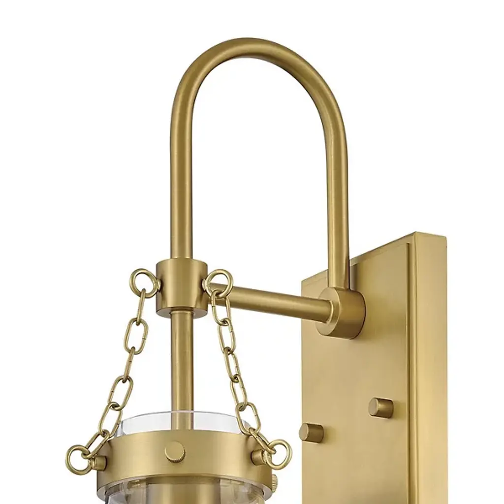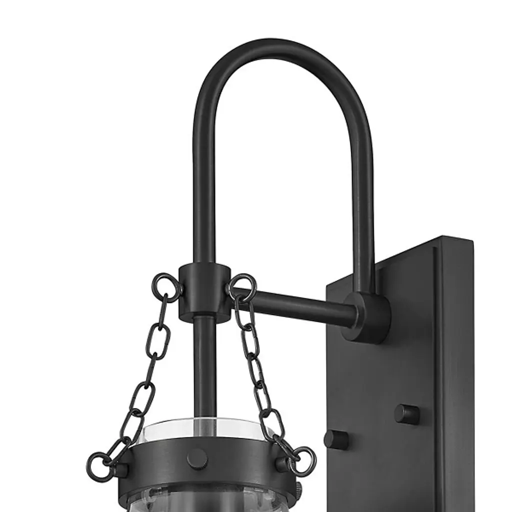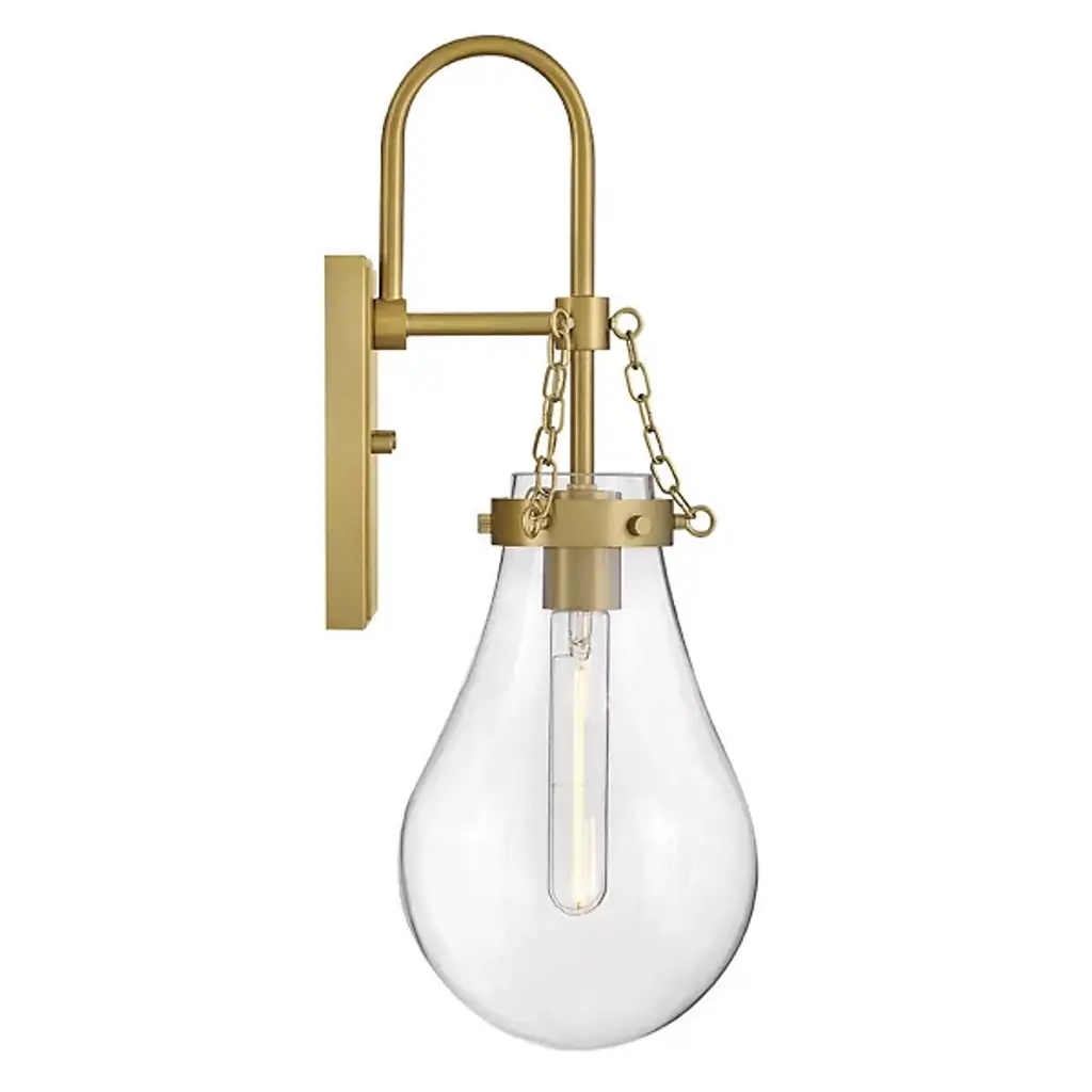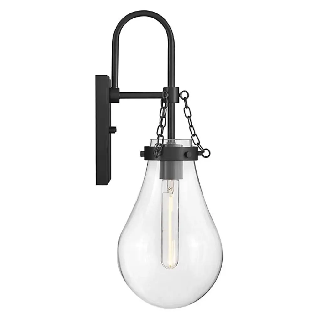The Eloise Wall Sconce from Hinkley bridges traditional and modern sensibilities through its mix of decorative and structural elements. It pairs an oversized raindrop-shaped glass shade with delicate chain detailing for contrast in scale and texture. The fixture's proportions create a sense of presence on the wall, with the transparent glass allowing full visibility of the bulb within. Fine chain links wrap around the glass, introducing an ornamental element that softens the otherwise straightforward geometry. The steel framework supports the composition, while the clear glass maintains an open and unobstructed design.