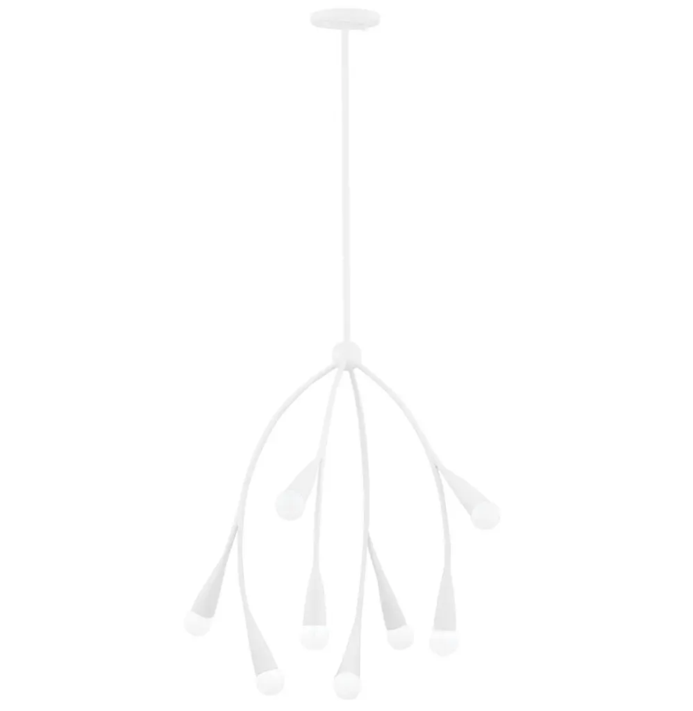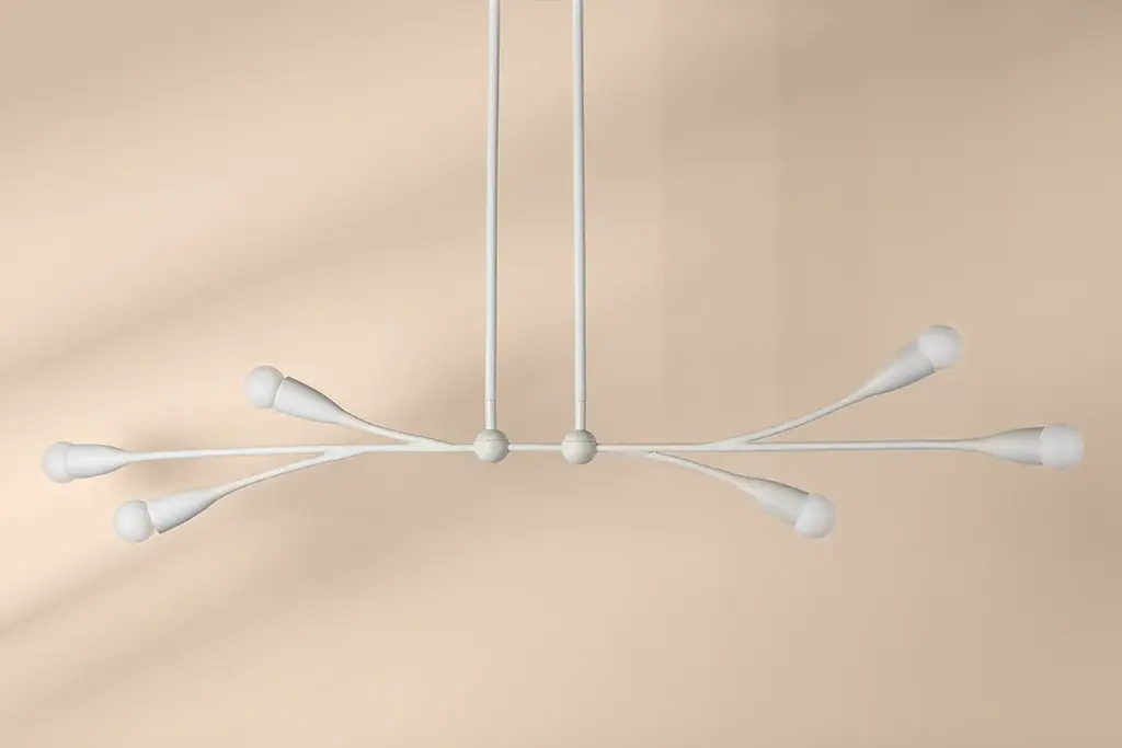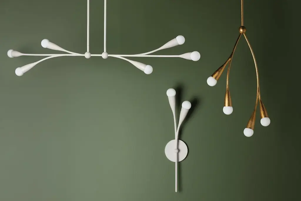Bursting with style, Elsa draws inspiration from cherry blossom trees. Slender arms branch out from small spheres, ending in buds of petite matte white globes. This soothing, organic design is available as a wall sconce, pendant, linear, and chandelier in Gold Leaf and Textured White. For the best look, we recommend G16.5 incandescent matte white finish bulbs.