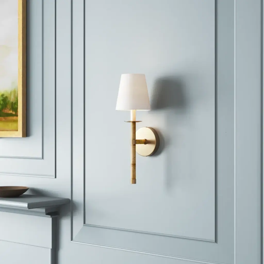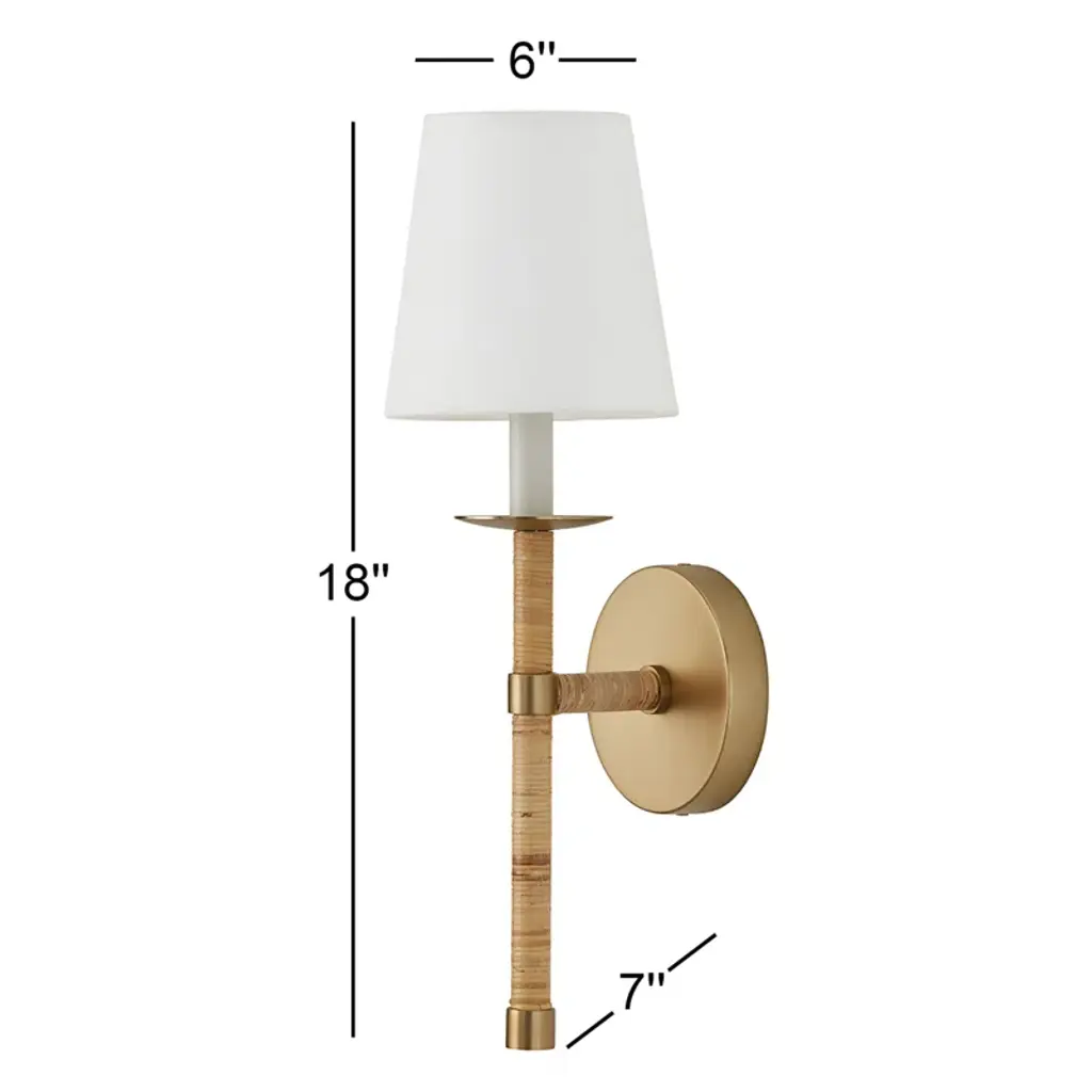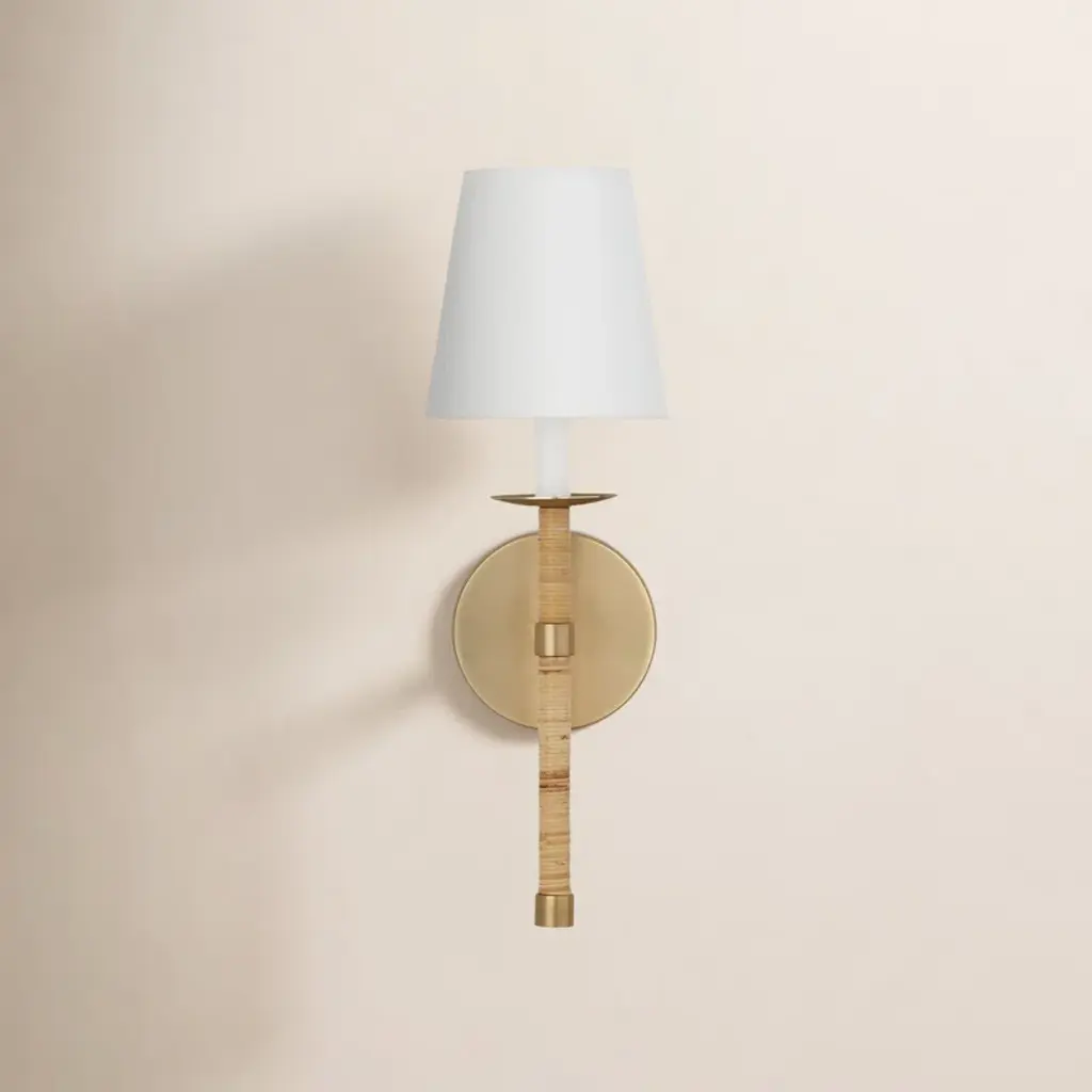 The Tulum Sconce creates a new look on natural style. The handwrapped rattan pairs perfectly with the crisp, white shade and hints of Matte Brass to bring bohemian chic to any space.