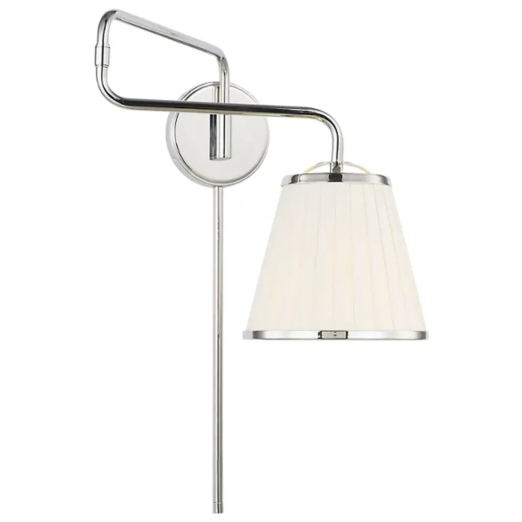 Sleek, modern lines are paired with a traditional ridged shade and dynamic details to create a standout wall sconce. A brass finish adds a polished touch, and an adjustable arm allows you to direct task lighting where you need to with this plug-in sconce.