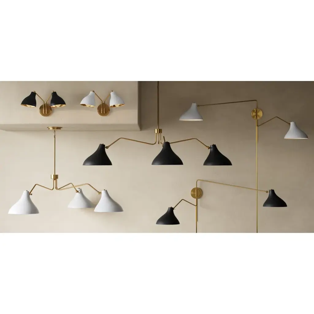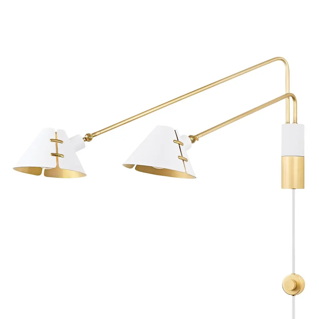 This 2-light adjustable wall sconce showcases curving vintage-inspired shades on long, dramatically angled arms and is finished in a stylish pairing of white or black with natural brass. Max 60 watts per bulb, standard size A19 bulbs recommended. LED bulb compatible. Can be hard-wired or plugged in.