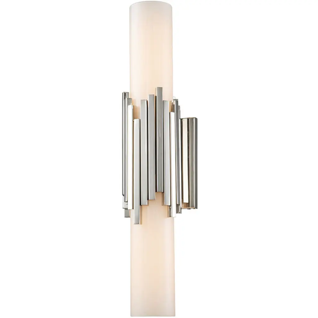 Classic meets contemporary with this sharp-looking sconce. Clear ribbed glass is cut at an angle delivering an unexpected update to its simple form. With the ability to move the glass can be turned facing the wall or away from it-creating a unique orientation of light in the space which it resides. A polished nickel band centers this piece to create more luxe and luster. Can be installed horizontally or vertically. Damp-rated although limited covered outdoor conditions may affect finish.
