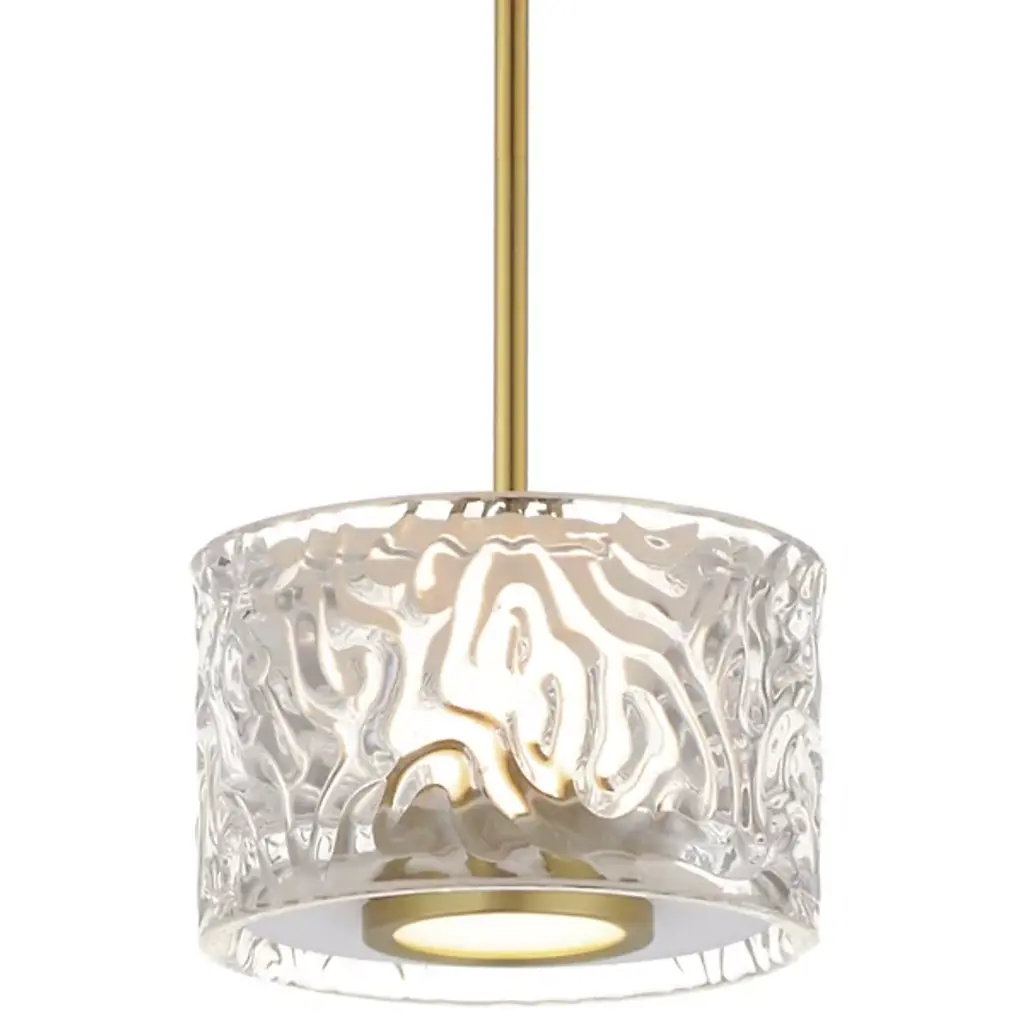 Segments of Clear glass cylinders are separated by distinctly rippled Clear crystal fonts on a thin Natural Aged Brass frame. The translucent segments are backlit with integrated LED illumination creating an airy, ethereal composition of glass textures. Available in vertical and horizontal configurations as well as sconce and portable configurations.