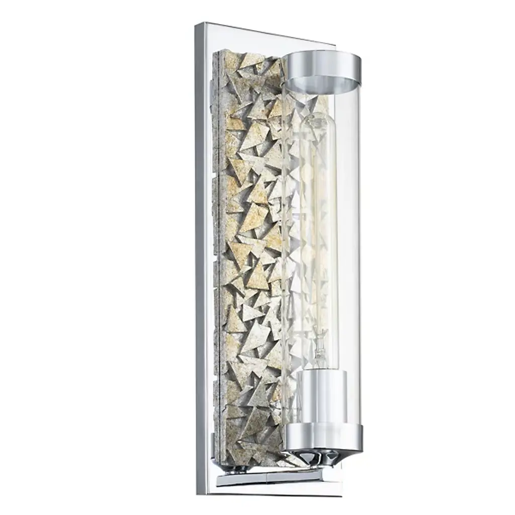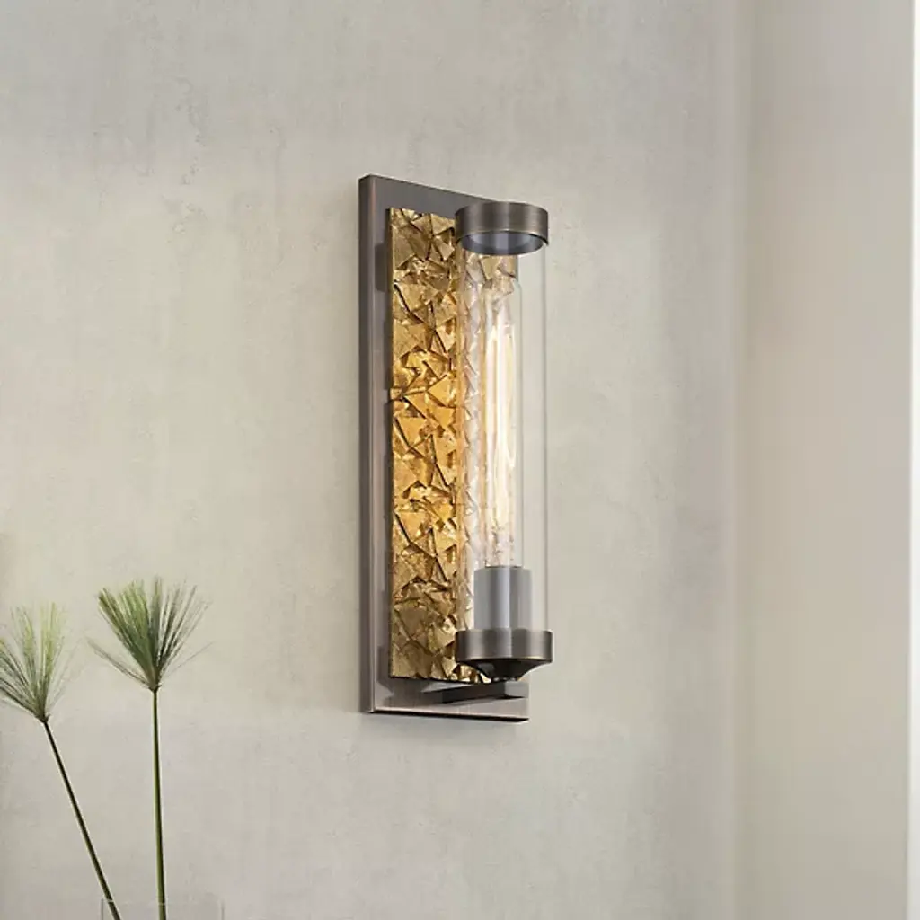 The Elysian Wall Sconce by Lucas McKearn gives your living space an elegant, rustic modern sensibility. A tubular shade of clear glass is properly secured by an intricate backplate. The eye is drawn to the sconce’s beautiful, textured design. Inside of the sconce’s glass shade rests an incandescent bulb that radiantly illuminates your environment.