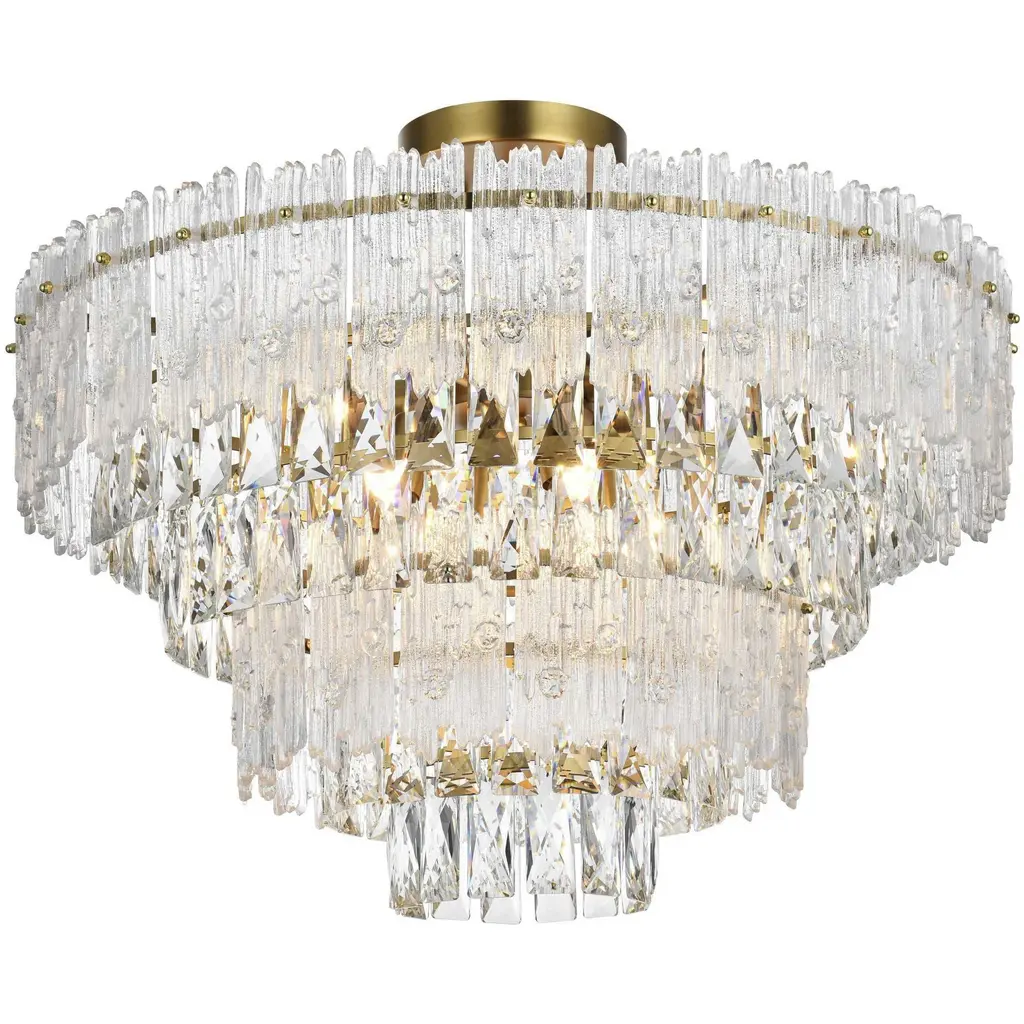 Transform your home with the opulent charm of this indoor lighting, meticulously designed to make a statement in any space. The light fixture showcases an intricate array of precision-cut clear crystals, each expertly faceted to maximize light refraction and create a dazzling display of brilliance. These crystals are complemented by textured glass accents that add depth and visual interest, casting a soft, shimmering glow across the room. Available in your choice of chrome or satin gold finishes, it is the epitome of luxury and modern elegance. As part of a coordinated collection, it also includes matching chandeliers, wall sconces and flush mounts, allowing you to create a harmonious lighting scheme throughout your home.