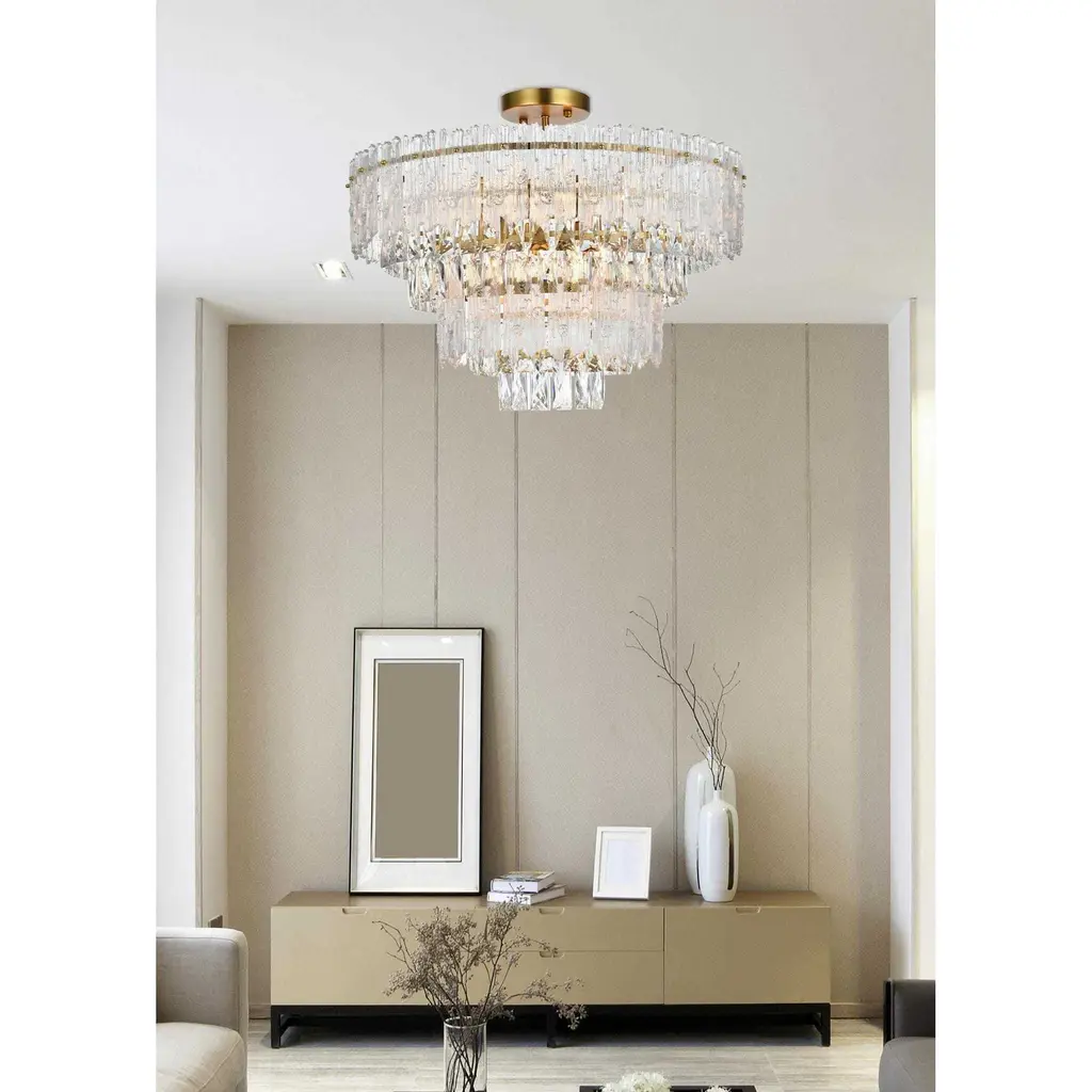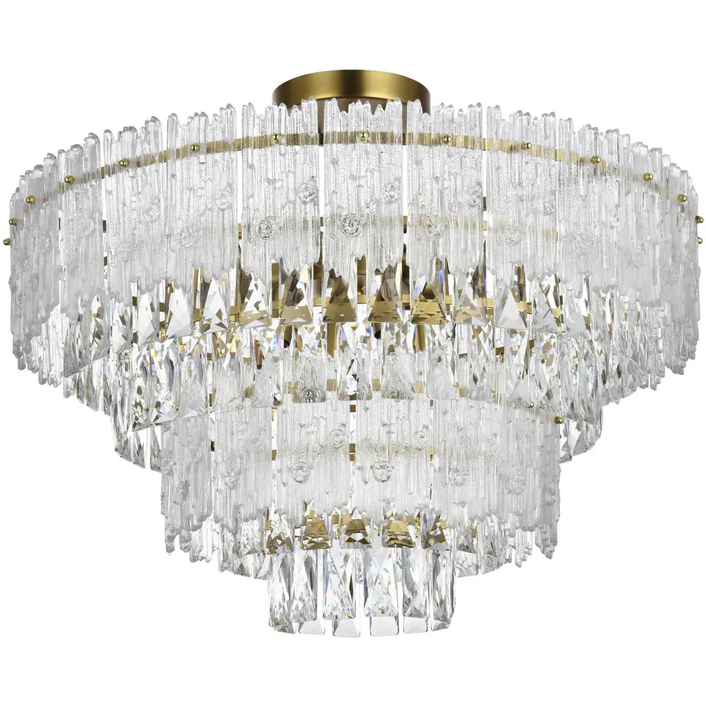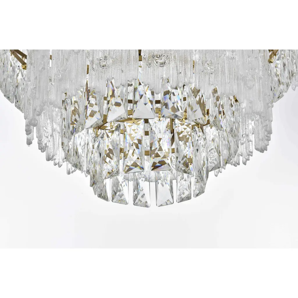 Transform your home with the opulent charm of this indoor lighting, meticulously designed to make a statement in any space. The light fixture showcases an intricate array of precision-cut clear crystals, each expertly faceted to maximize light refraction and create a dazzling display of brilliance. These crystals are complemented by textured glass accents that add depth and visual interest, casting a soft, shimmering glow across the room. Available in your choice of chrome or satin gold finishes, it is the epitome of luxury and modern elegance. As part of a coordinated collection, it also includes matching chandeliers, wall sconces and flush mounts, allowing you to create a harmonious lighting scheme throughout your home.