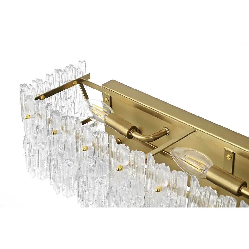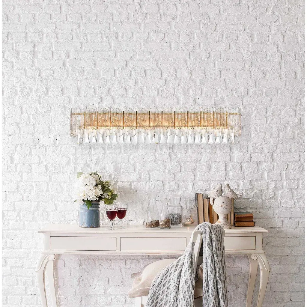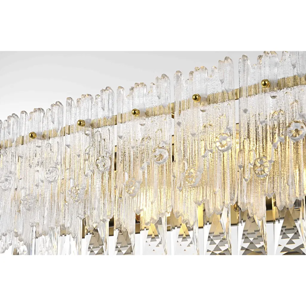 Transform your home with the opulent charm of this indoor lighting, meticulously designed to make a statement in any space. The light fixture showcases an intricate array of precision-cut clear crystals, each expertly faceted to maximize light refraction and create a dazzling display of brilliance. These crystals are complemented by textured glass accents that add depth and visual interest, casting a soft, shimmering glow across the room. Available in your choice of chrome or satin gold finishes, it is the epitome of luxury and modern elegance. As part of a coordinated collection, it also includes matching chandeliers, wall sconces and flush mounts, allowing you to create a harmonious lighting scheme throughout your home.