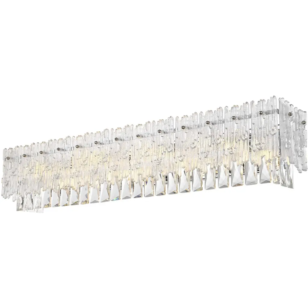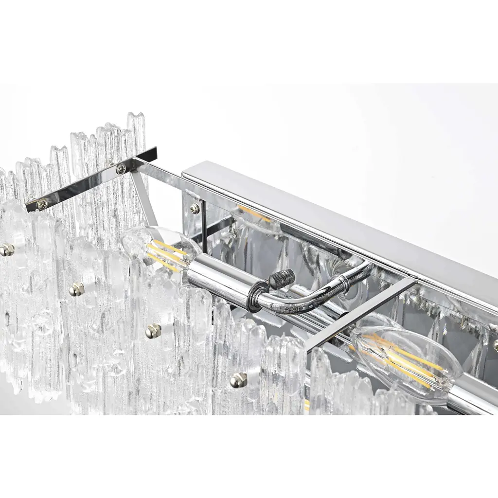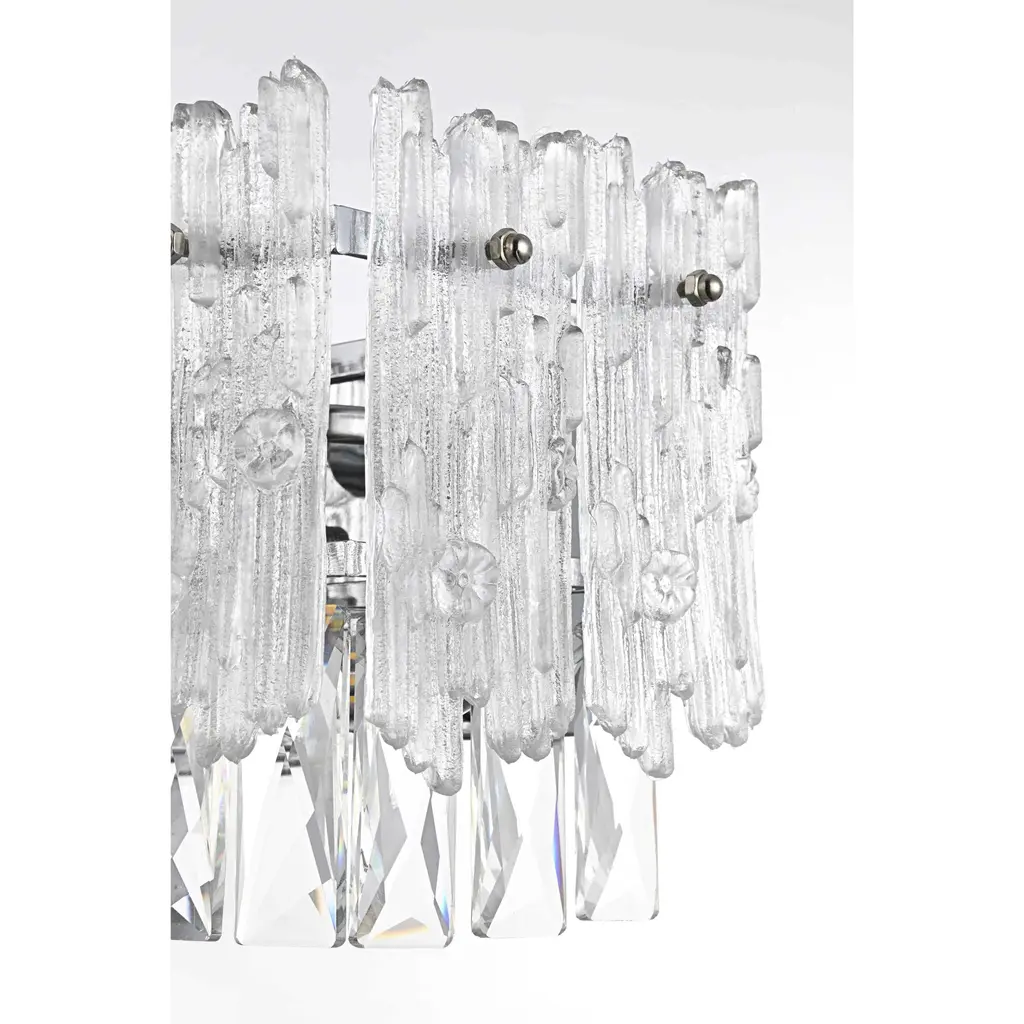 Transform your home with the opulent charm of this indoor lighting, meticulously designed to make a statement in any space. The light fixture showcases an intricate array of precision-cut clear crystals, each expertly faceted to maximize light refraction and create a dazzling display of brilliance. These crystals are complemented by textured glass accents that add depth and visual interest, casting a soft, shimmering glow across the room. Available in your choice of chrome or satin gold finishes, it is the epitome of luxury and modern elegance. As part of a coordinated collection, it also includes matching chandeliers, wall sconces and flush mounts, allowing you to create a harmonious lighting scheme throughout your home.