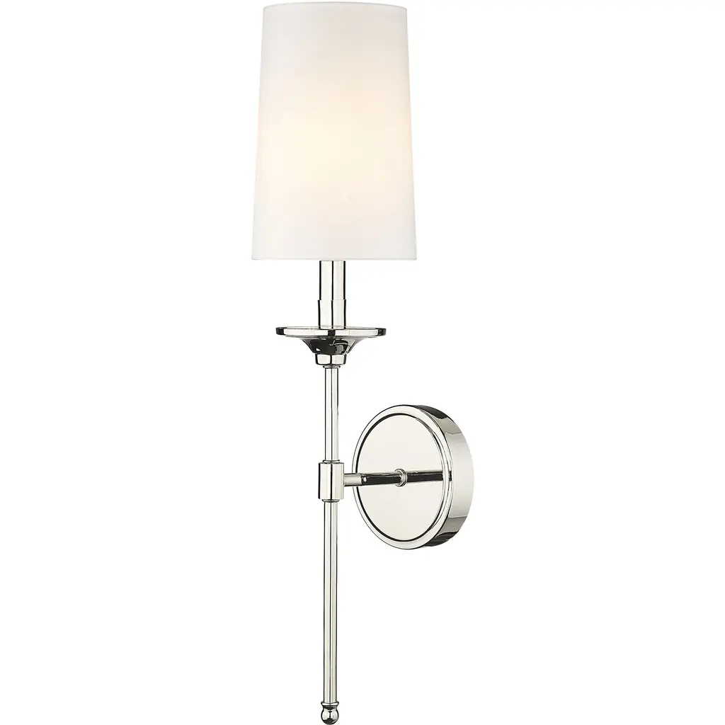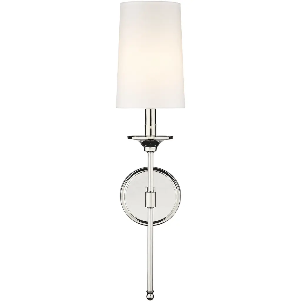 Ideal for a traditional or transitional design scheme, the sleek, elegant Emily sconce creates a warm and inviting atmosphere. This single-light wall sconce features a gleaming, polished nickel finish and a classic cloth shade for a softly diffused glow.