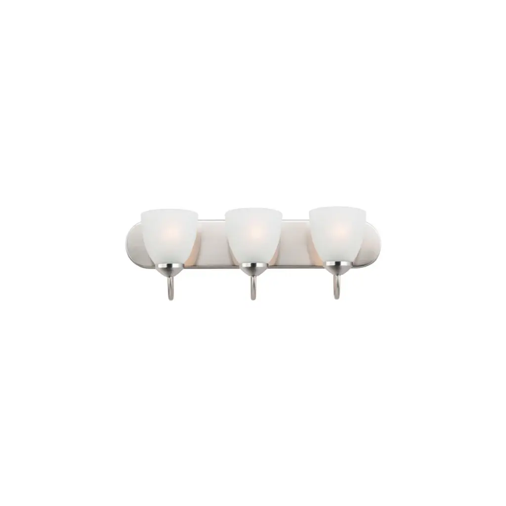 The Emmons three light vanity fixture in brushed nickel is an ENERGY STAR½ qualified lighting fixture that uses LED bulbs to save you both time and money. The Emmons lighting collection by combines form and function in a traditional empire silhouette. Trumpeted Satin Etched glass shades and a circular finial further enhance the design. Cluster three sizes together in a multi-fixture installation to make a beautifully dramatic statement in the living room, foyer, entryway or family room. The Emmons collection comes in two finishes: Brushed Nickel and Heirloom Bronze. Its assortment includes three-, five- and nine-light chandeliers; one-light mini pendant, three-light pendant, two-light semi-flush mount; one-light wall sconce; and two-, three- and four- light bath vanity fixtures. Incandescent and ENERGY STAR-qualified LED lamping are available; all fixtures are California Title 24 compliant.