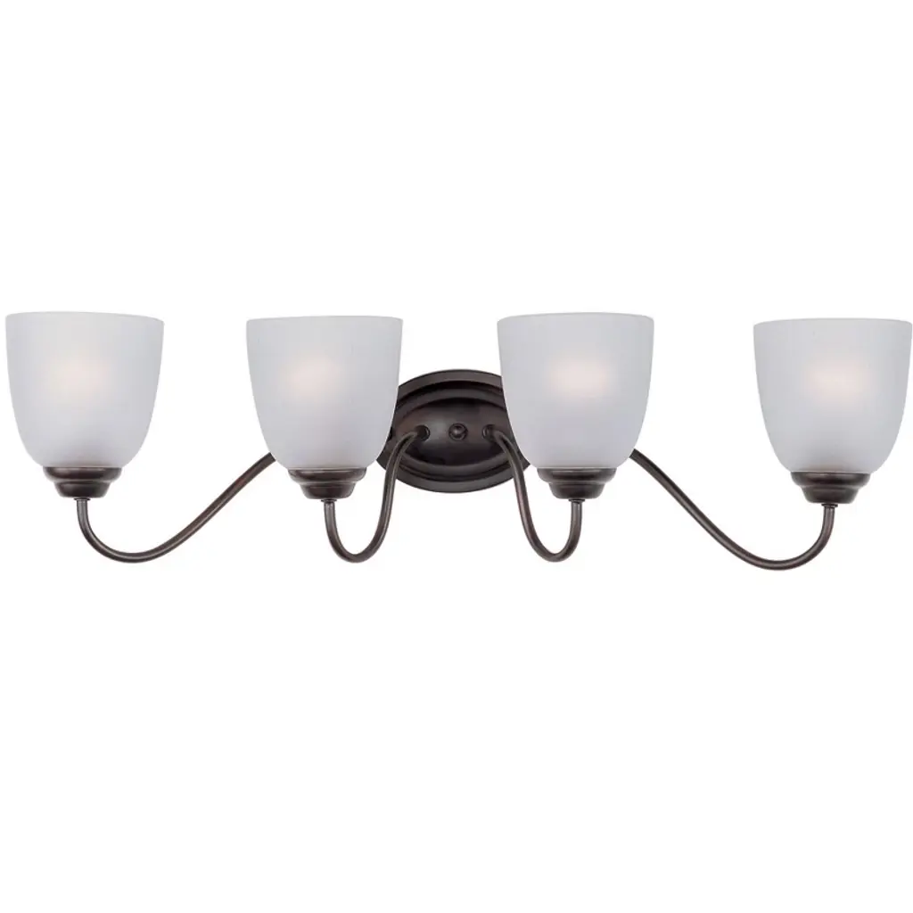The Emmons four light vanity fixture in bronze provides abundant light for your bath vanity, while adding a layer of today's style to your interior design. The Emmons lighting collection by combines form and function in a traditional empire silhouette. Trumpeted Satin Etched glass shades and a circular finial further enhance the design. Cluster three sizes together in a multi-fixture installation to make a beautifully dramatic statement in the living room, foyer, entryway or family room. The Emmons collection comes in two finishes: Brushed Nickel and Heirloom Bronze. Its assortment includes three-, five- and nine-light chandeliers; one-light mini pendant, three-light pendant, two-light semi-flush mount; one-light wall sconce; and two-, three- and four- light bath vanity fixtures. Incandescent and ENERGY STAR-qualified LED lamping are available; all fixtures are California Title 24 compliant.