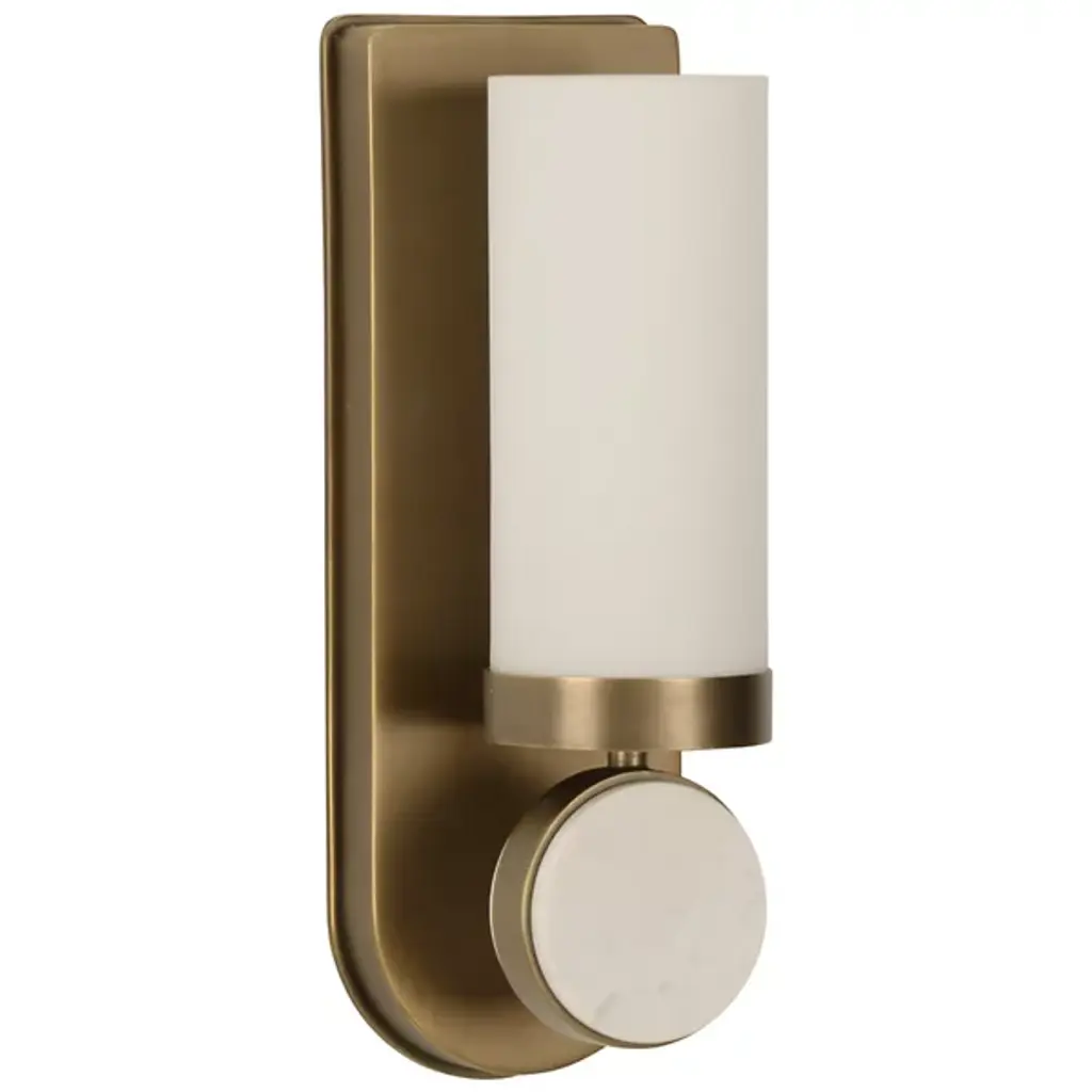 The Emmons Wall Sconce from Wildwood embodies elegance, designed to complement any space, style, or era. Its blend of materials—metal, glass, and honed Carrera marble—creates a visually striking statement. Two honed Carrera marble spheres frame the central glass column, adding a refined touch. Versatile in placement, this sconce can be installed vertically or horizontally, making it ideal for flanking bathroom vanities or accenting hallways. Damp-rated for durability, it offers both style and functionality with enduring appeal.