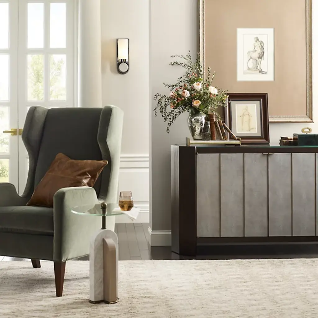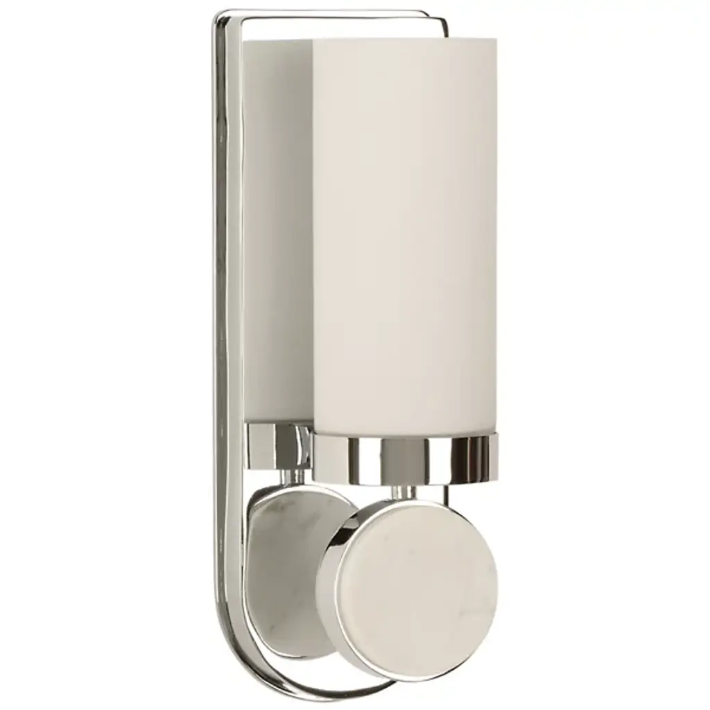The Emmons Wall Sconce from Wildwood embodies elegance, designed to complement any space, style, or era. Its blend of materials—metal, glass, and honed Carrera marble—creates a visually striking statement. Two honed Carrera marble spheres frame the central glass column, adding a refined touch. Versatile in placement, this sconce can be installed vertically or horizontally, making it ideal for flanking bathroom vanities or accenting hallways. Damp-rated for durability, it offers both style and functionality with enduring appeal.