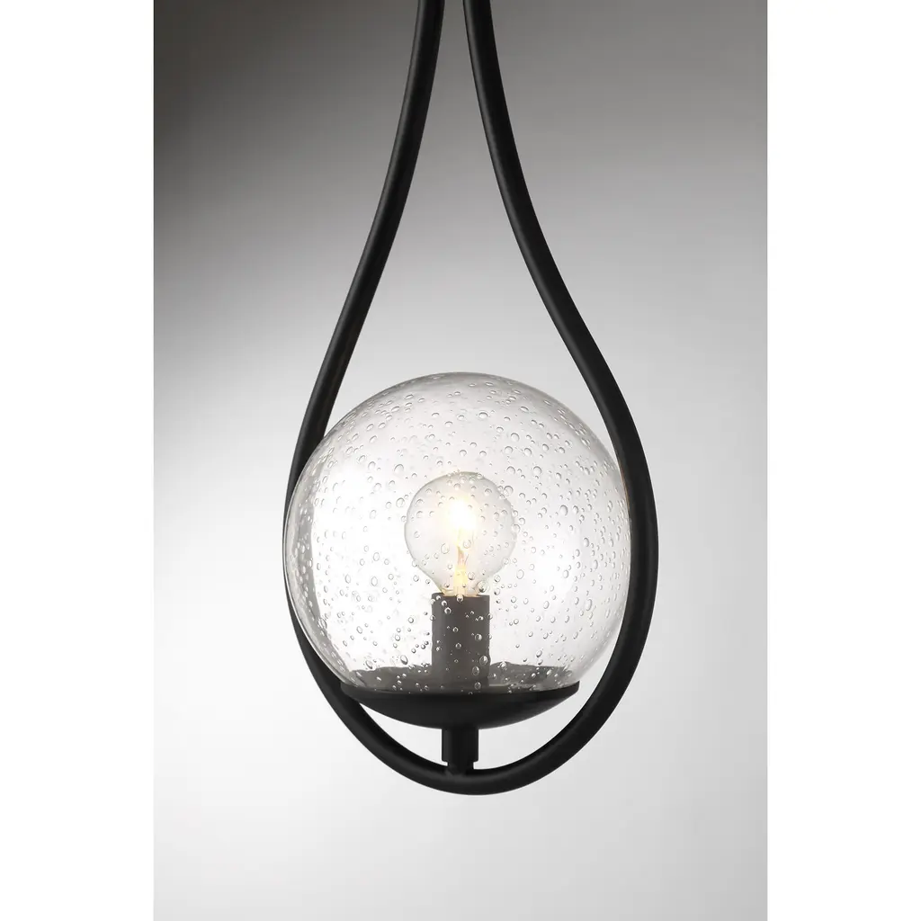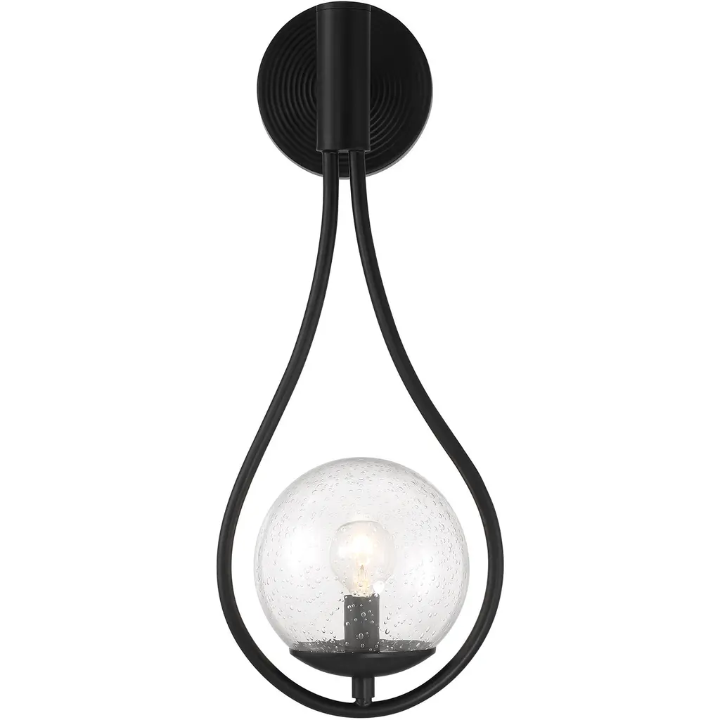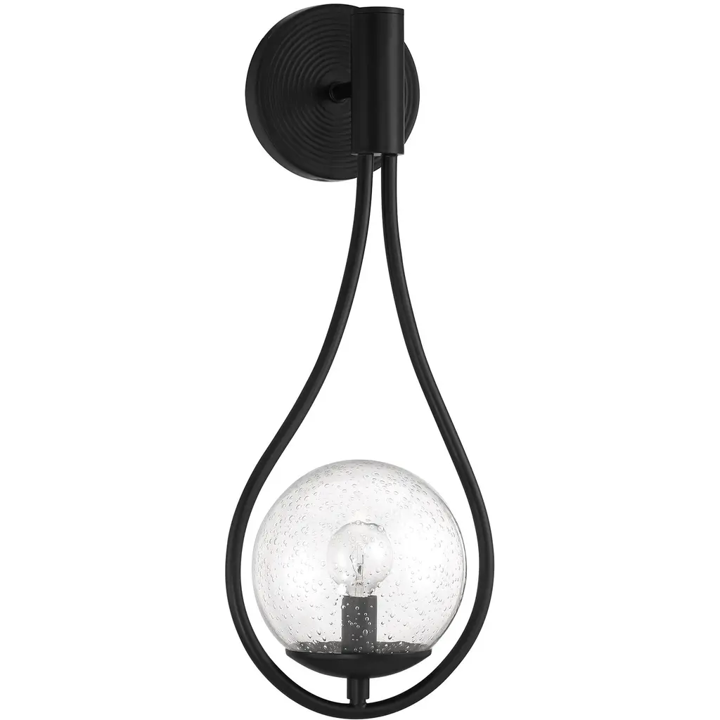 The beautiful teardrop-shaped Savoy House Encino 1-light sconce infuses any room with an eye-catching touch of illumination and style. An orb of clear seeded glass adds extra texture. Finished in Matte Black. Encino is 20" in height, 8" in width and extends 7.5" from the wall. Uses one candelabra size bulb of up to 60 watts. The bulb is not included. Encino is damp area rated.