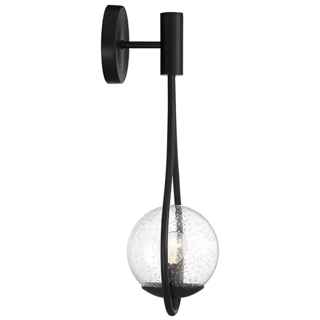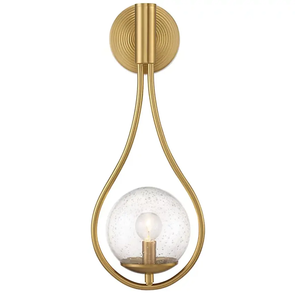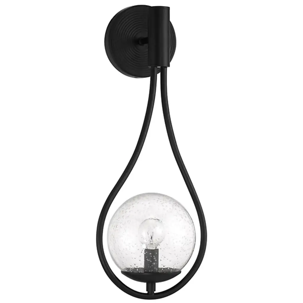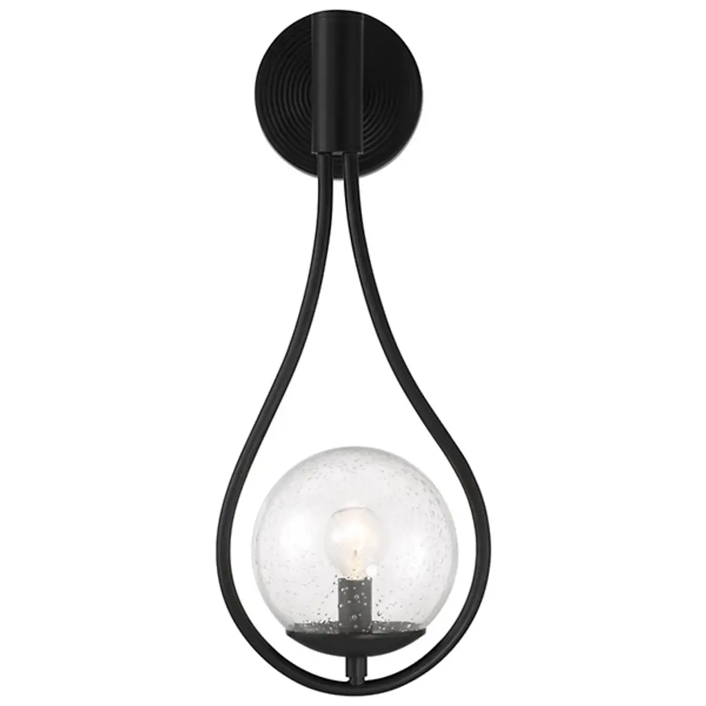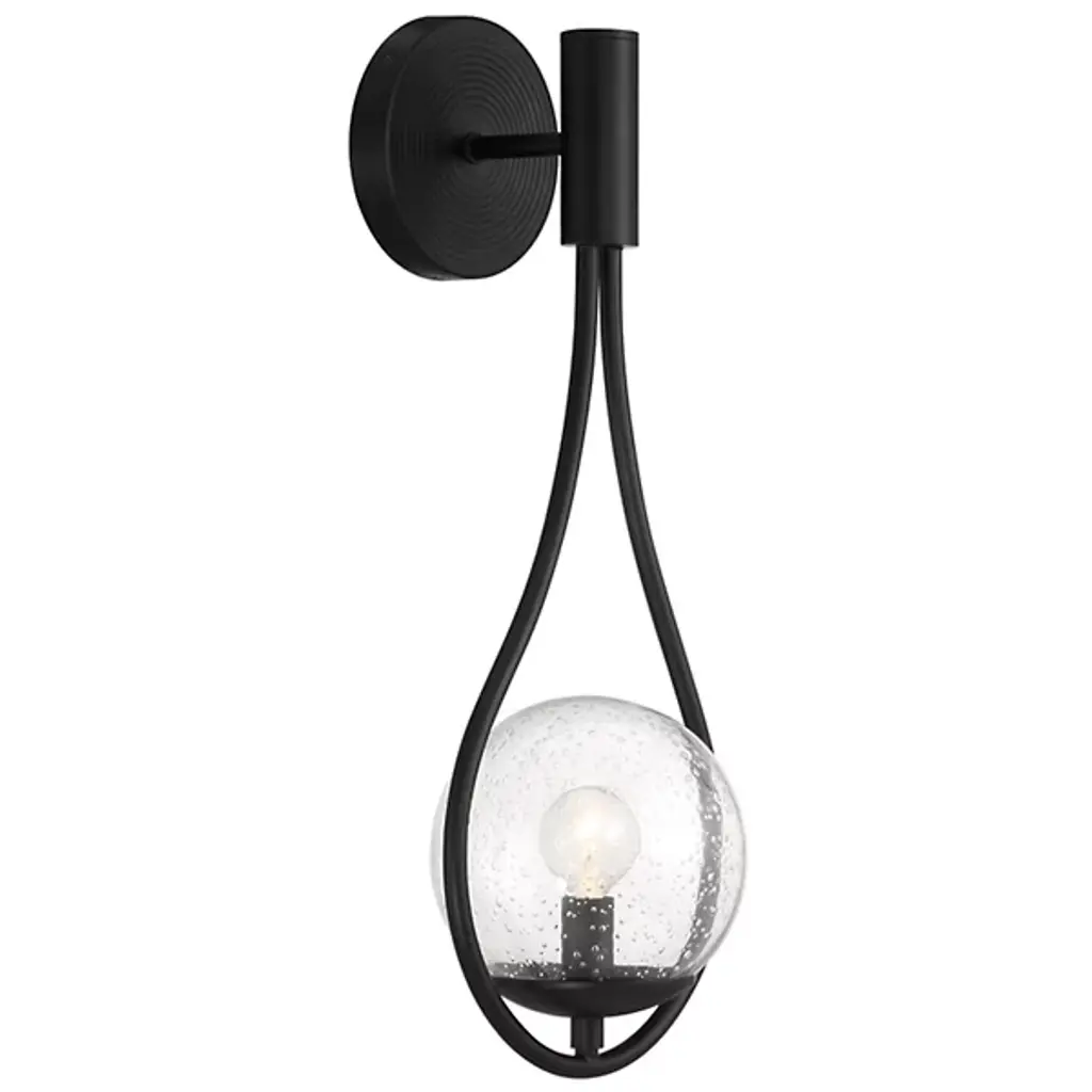 The Encino Wall Sconce from Savoy House introduces a striking blend of transitional style and sophisticated illumination. Its teardrop shape is accentuated by a clear seeded glass orb, which enhances the texture and visual interest. This elegant sconce offers a captivating light source that complements a variety of interiors, infusing any space with charm and modern appeal. The slim metal frame provides a refined accent, while damp-listed lamping enhances its versatility.