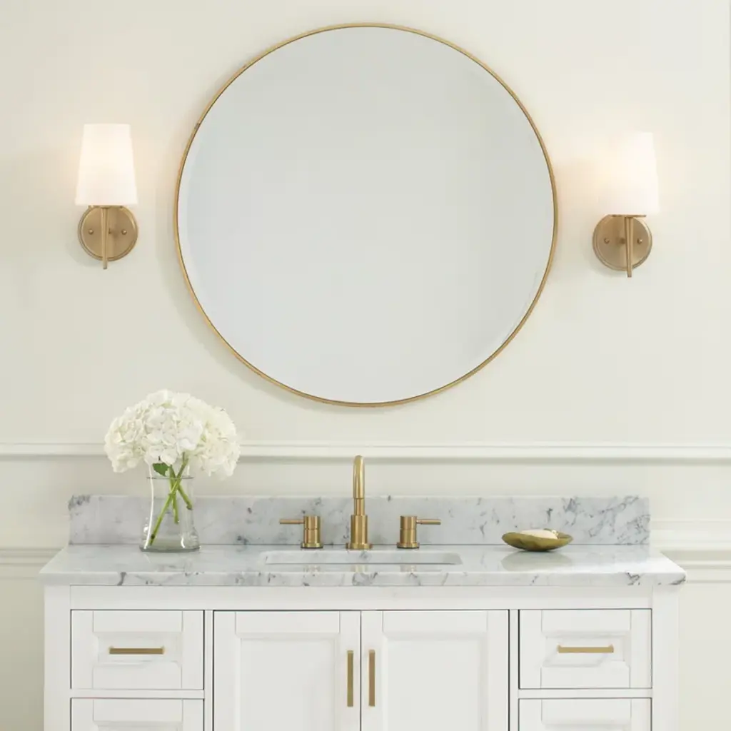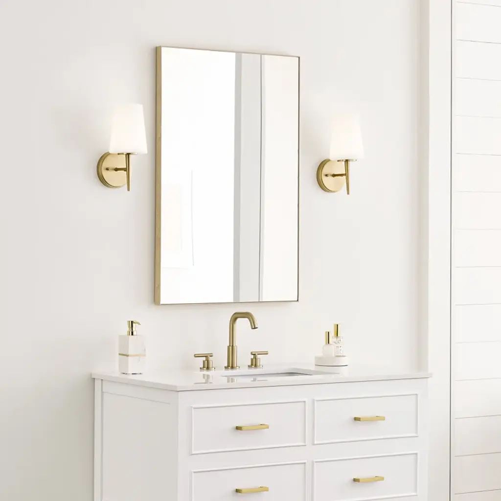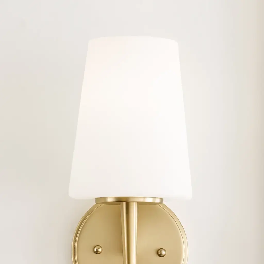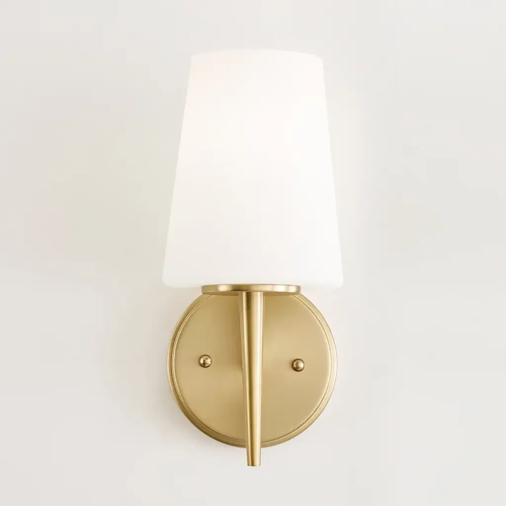 This classic 1-light armed sconce offers ambient lighting that's just right for your bedroom, hallway, or entryway. Crafted from steel, it's mounted on a circular metal backplate with the metallic finish of your choice, so it's easy to incorporate into your existing style or color palette. The white glass empire shade diffuses light from a single bulb (sold separately). For added versatility, this sconce boasts dimmer switch compatibility, and it's rated safe to use in damp locations like bathrooms or kitchens.