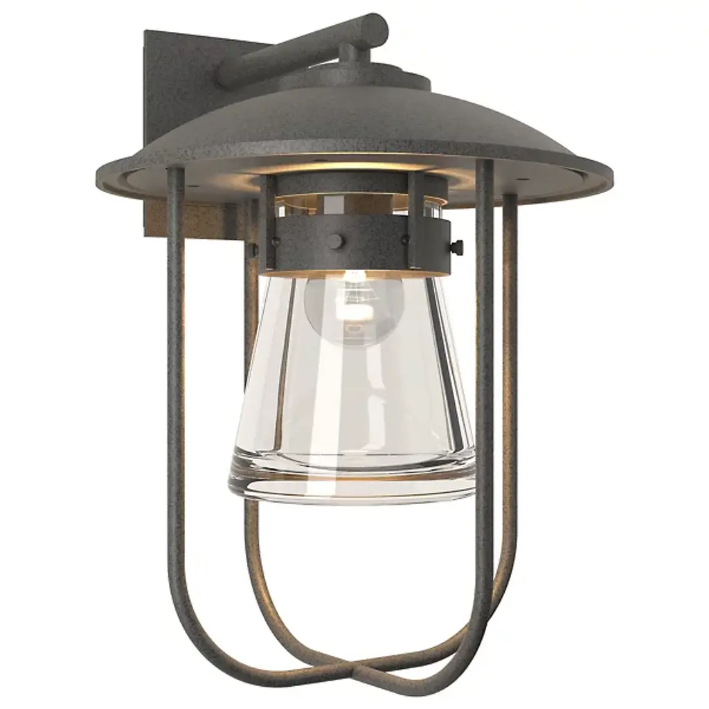 Beautifully modern, classic design. The Erlenmeyer Large Outdoor Wall Sconce from Hubbardton Forge brings coastal flair to any outdoor space. Reminiscent of New England landscape and lighthouses, this fixture features a thick glass shade and a robust metal cage surrounding it. A coastal finish helps repel even the harshest of weather, allowing it to last for years to come. Each piece is made to order by artisans in Vermont.