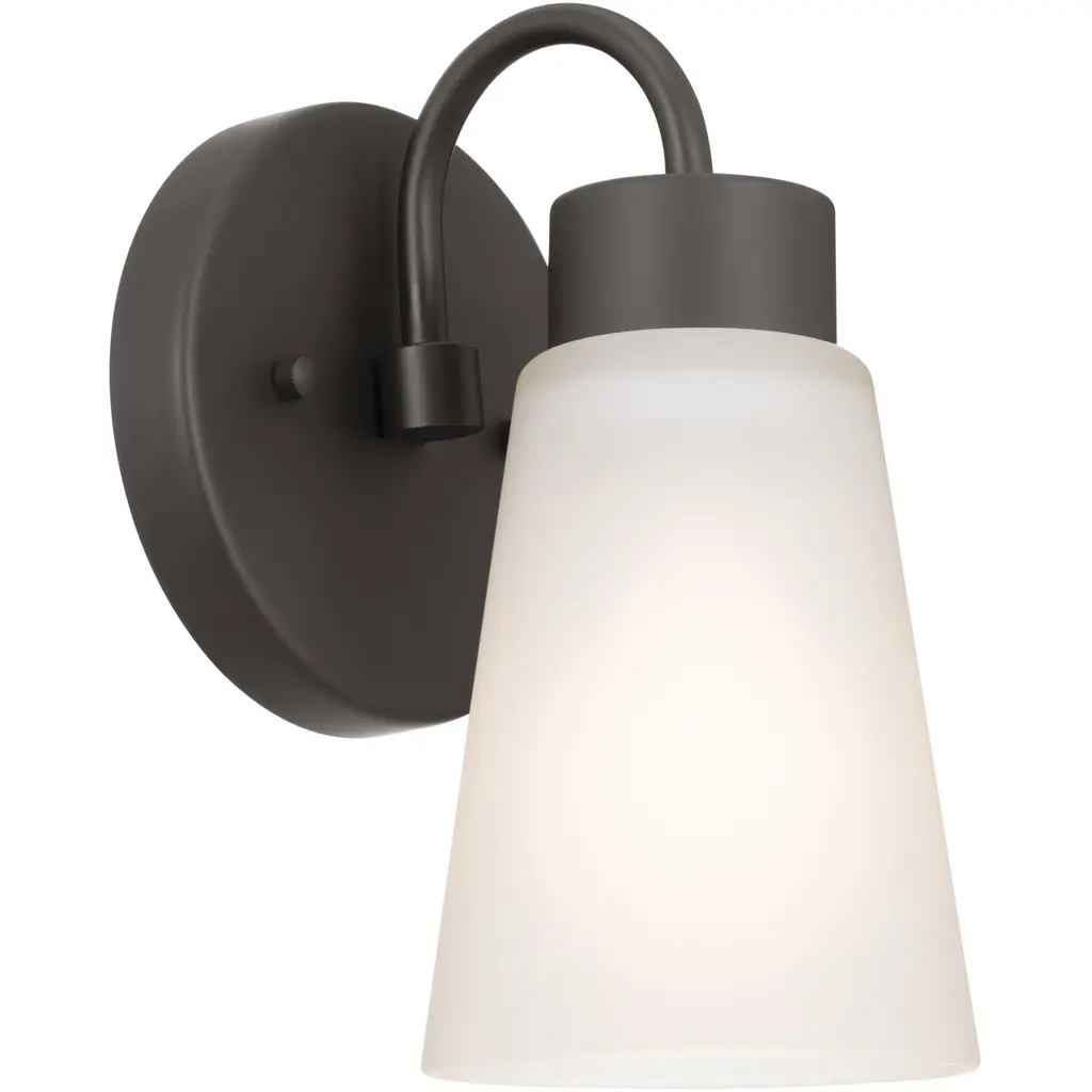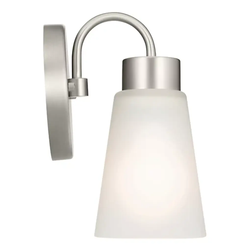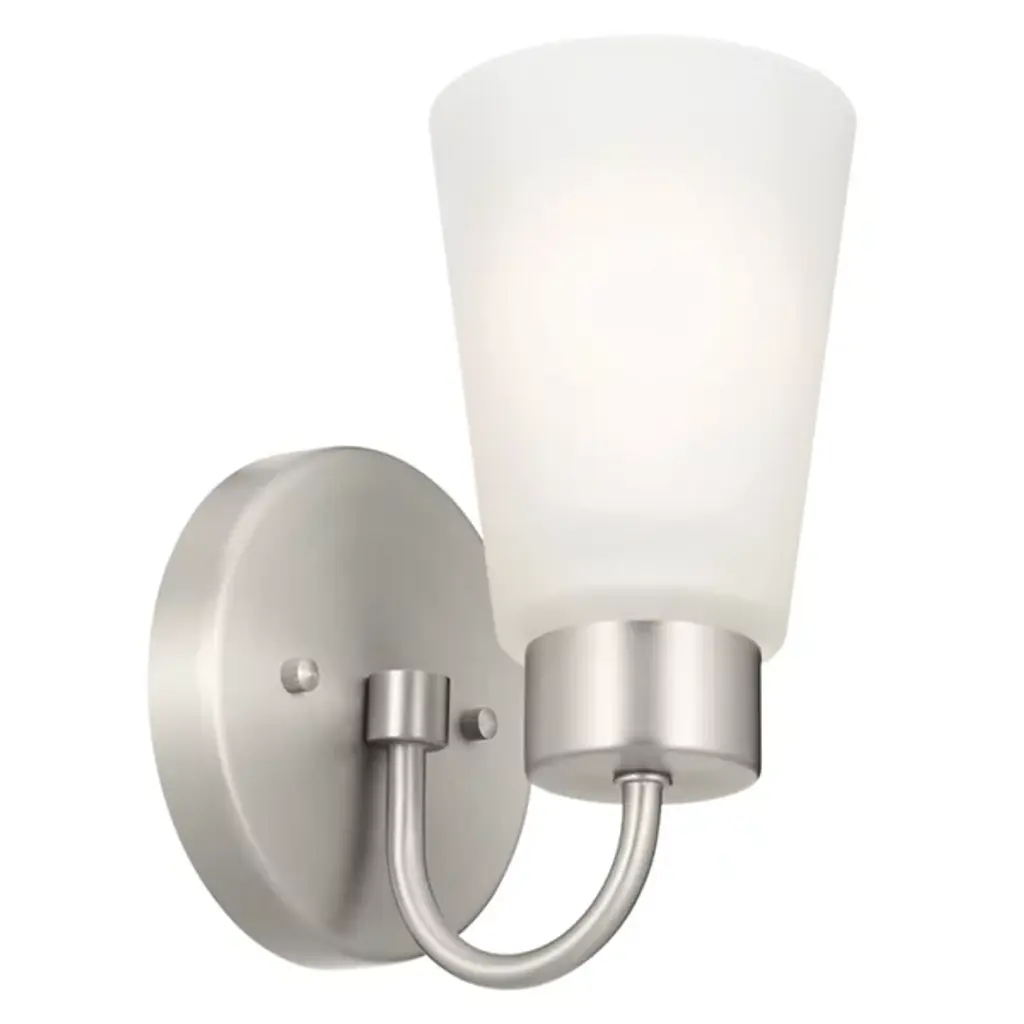 The Erma Bath Wall Sconce from Kichler combines real-world functionality with distinguished design elements. The steel frame supports a clear satin-etched glass shade that provides gentle illumination perfect for bathroom settings. An arched arm extends gracefully from the mounting plate, positioning the light at an ideal angle for vanity lighting. The damp location rating makes this sconce suitable for bathroom environments where moisture resistance is essential.