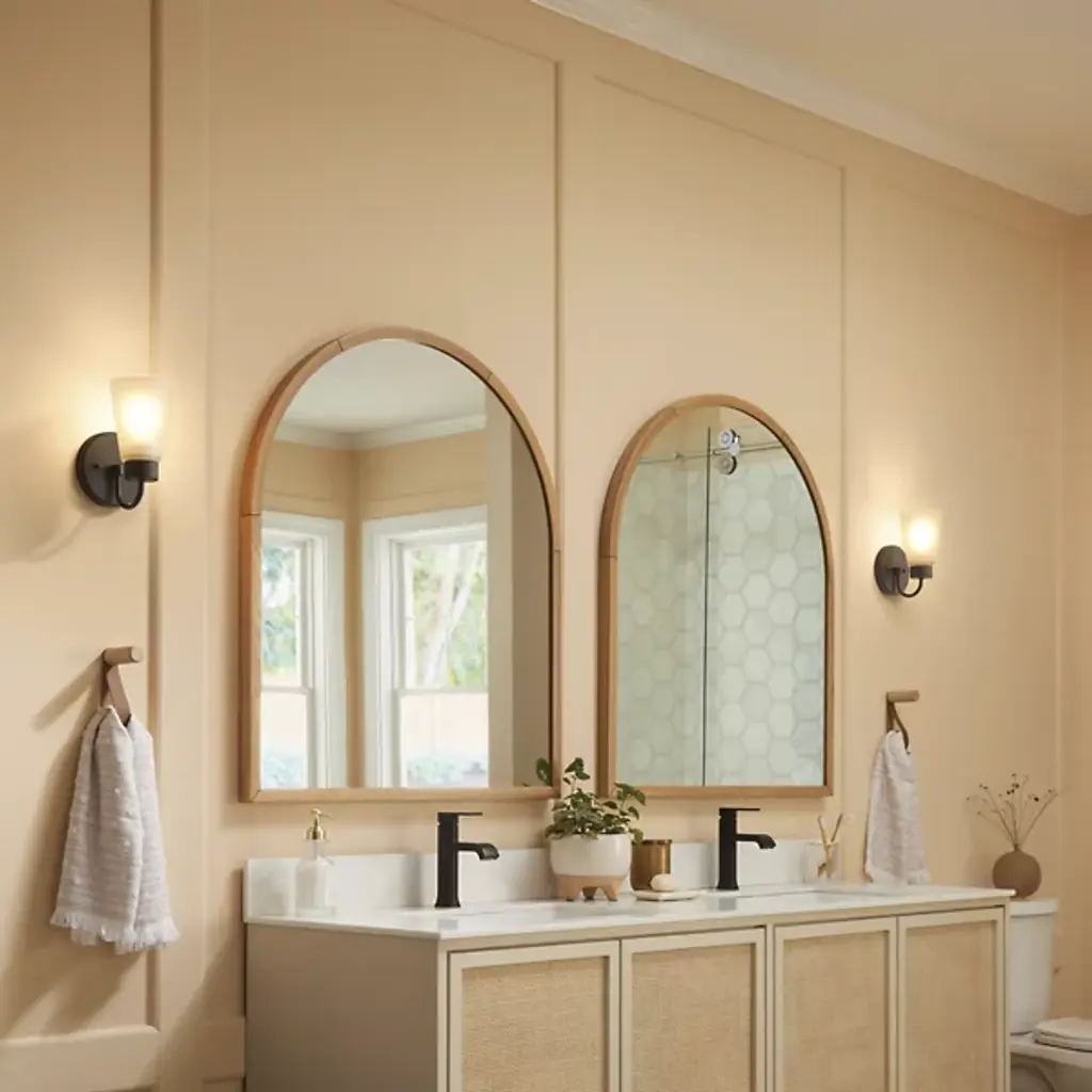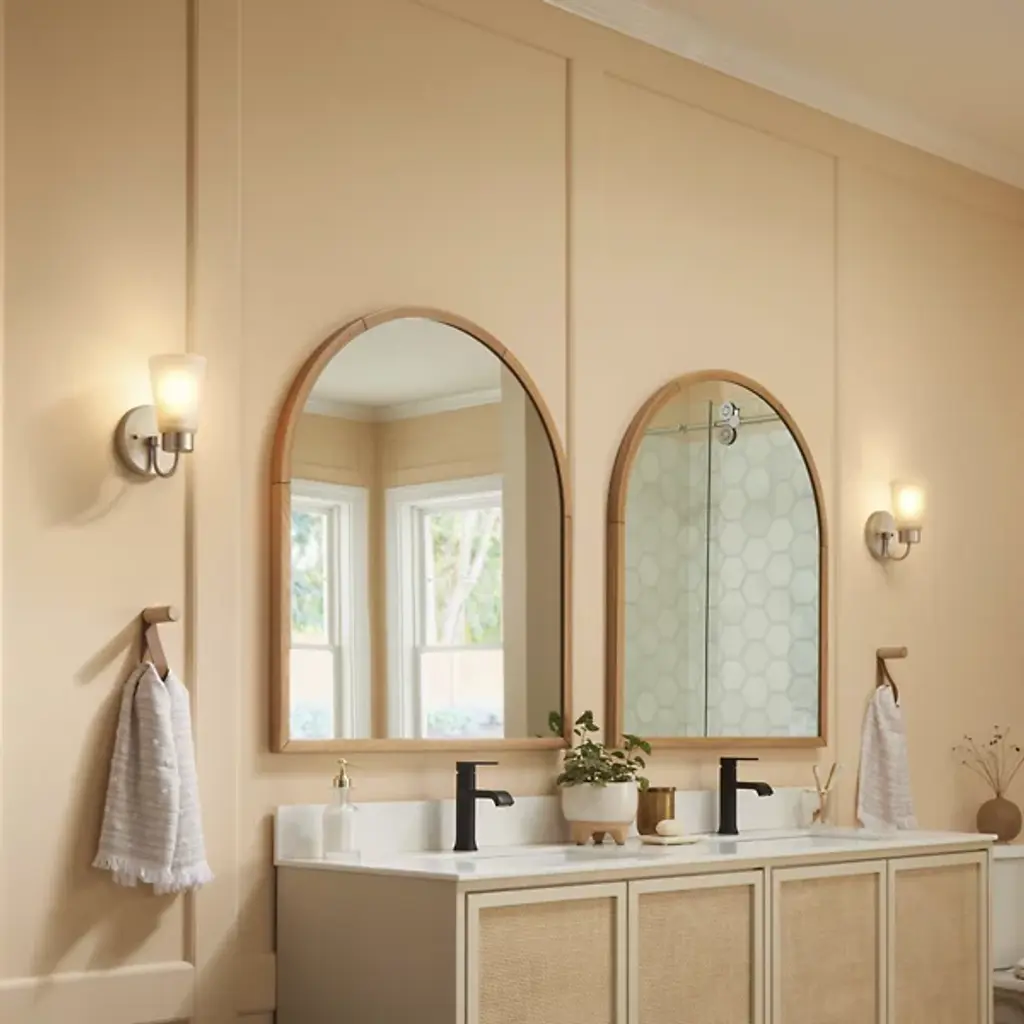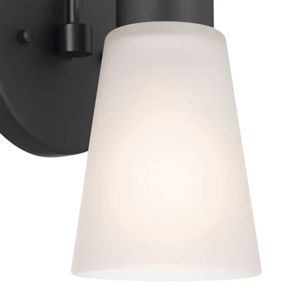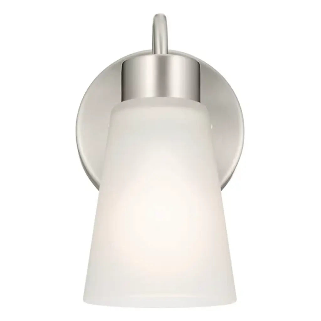 The Erma Bath Wall Sconce from Kichler combines real-world functionality with distinguished design elements. The steel frame supports a clear satin-etched glass shade that provides gentle illumination perfect for bathroom settings. An arched arm extends gracefully from the mounting plate, positioning the light at an ideal angle for vanity lighting. The damp location rating makes this sconce suitable for bathroom environments where moisture resistance is essential.