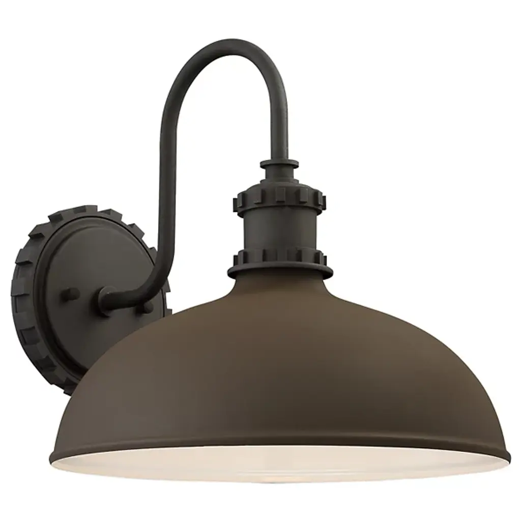 Add character and improve nighttime visibility with an Escudilla Outdoor Wall Sconce by Minka-Lavery. It's a classic gooseneck design with a dome shade to direct illumination down onto entryways, porches and patios. Rugged notched details on the round wall-mounted plate and lightbulb socket give it industrial chic that complements contemporary or transitional homes. From the Great Outdoors collection, this exterior light fixture is constructed of aluminum for durability and is dimmable for versatility.