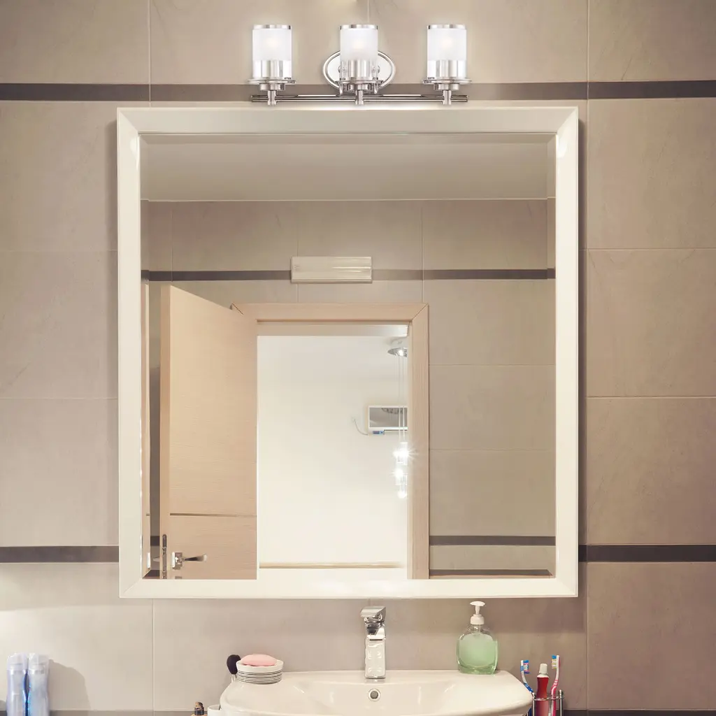 The Essence Collection comes in Chrome with Sand/Clear glass. This Contemporary Essence 3 Light Bath Bar will complement the decor in any room of your home. Made with solid steel construction to look great and last for years to come.