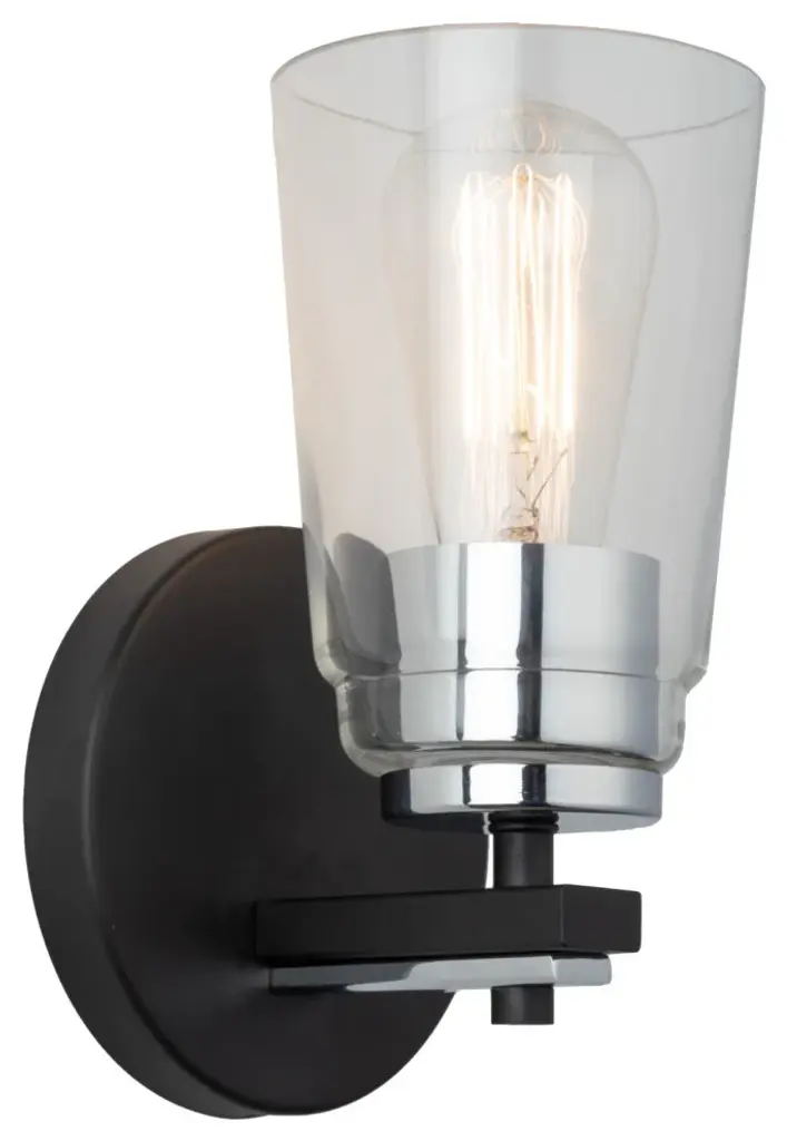 The Essex collection features elegant clear glassware, adding a touch of sophistication to any bathroom decor. Its standout design is characterized by a striking dual-tone finish, combining sleek black and chrome elements seamlessly. This collection effortlessly blends modern aesthetics with functional utility, creating a stylish focal point for your bathroom space.Features:Adjust your lighting to suit any mood or activity with our dimmable feature.Enjoy peace of mind with our Limited Lifetime Warranty, ensuring long-term protection and satisfaction.Easy InstallationEnjoy peace of mind with our Limited Lifetime Warranty, ensuring long-term protection and satisfaction.Requires 1 x 60 watt Incandescent/LED (Not Included.)