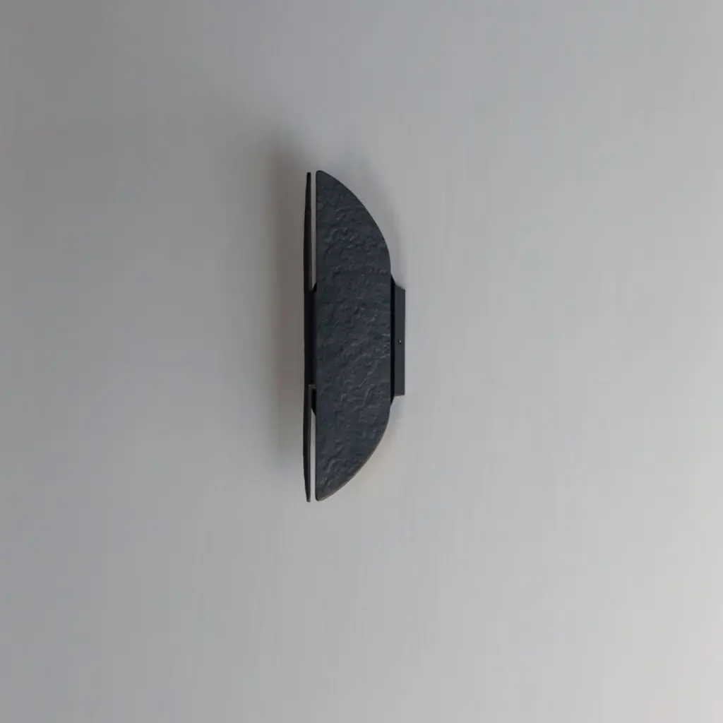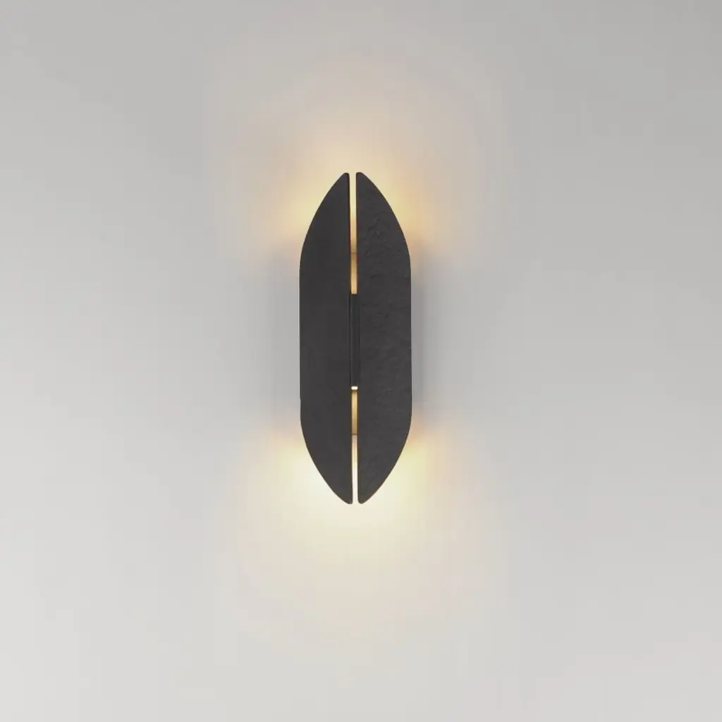 An enigmatic light source projects from the wall, obscured by two panels with an organic textural relief and split down the center to cast soft ambient light. Open at the top and bottom as well, the light shines both upwards and downwards and signals the source of its illumination through the crevice that it creeps out from. Finished in Matte Black externally, the interior of the sconces are powder coated antique brass to add warmth to the rustic glow. Available in 3 sizes, this ADA compliant sconce series adds mystique to the spaces it's installed.