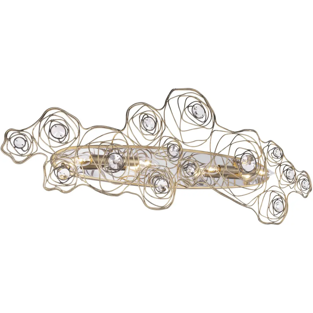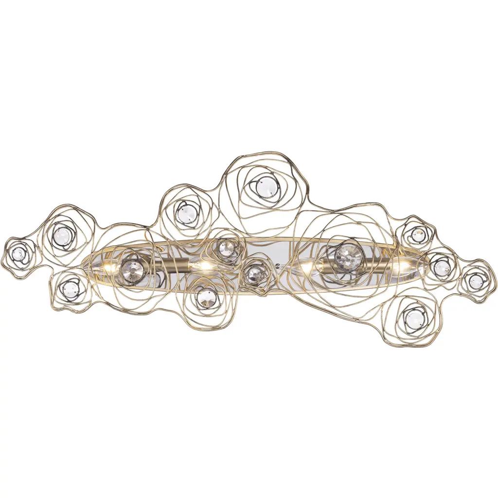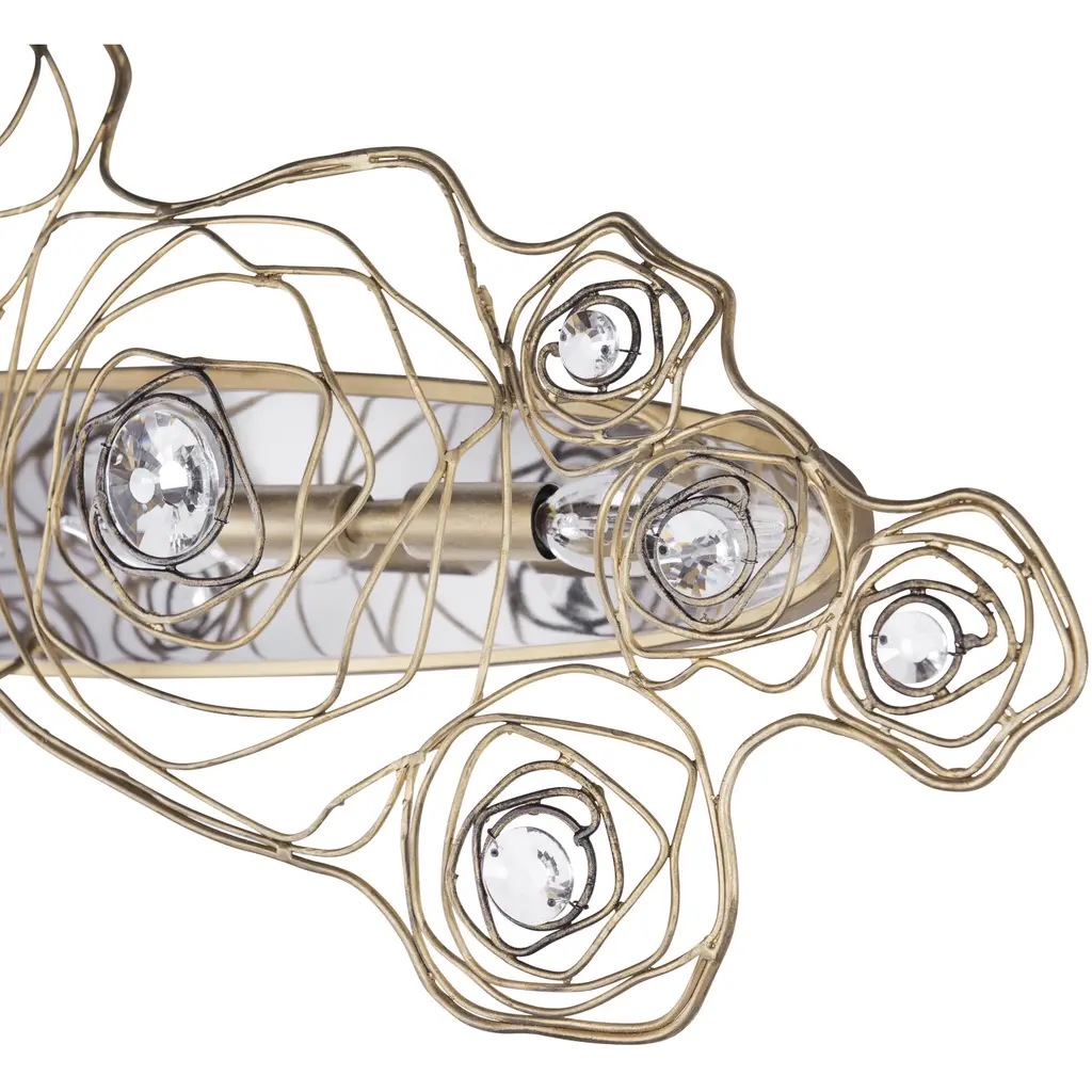 A rose is a rose is a rose, until of course, it is reimagined by Varaluz. Inspired by a drawing that appeared in the Japanese design magazine, Shin-Bijutsukai (New Oceans of Art), Ethereal Rose marries swirling lines of varying thicknesses and irregular curves with a mid-century metal work technique. At the center of each rose is a multi-faceted round optic quality crystal element. The hanging stems and secondary canopy complete the wispy design motif. A Havana Gold hand-painted multi-layered finish features a unique ombre that gets darker with additional antiquing around the crystal centers.