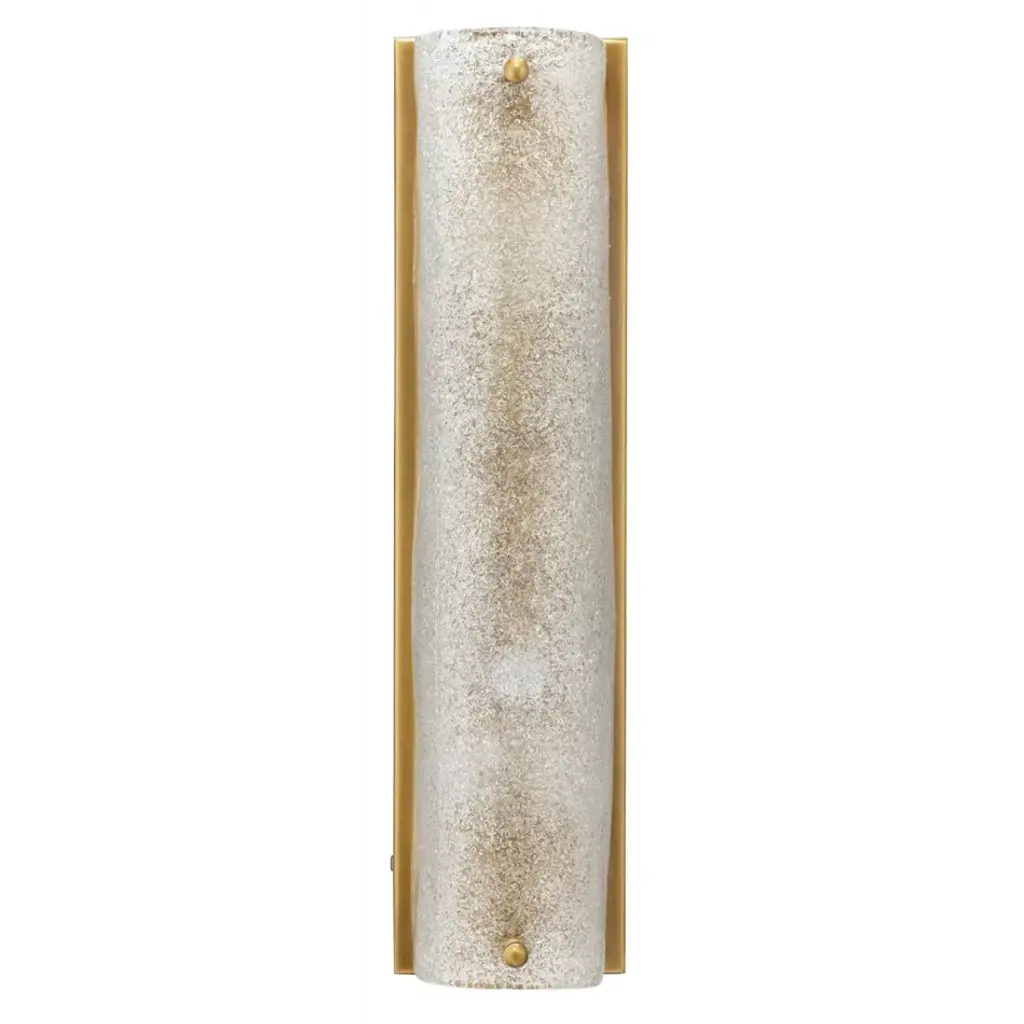 The LED concealed by opaque glass provides the illumination for our large sconce. But the real shining design element is the seeded, thick glass panel. Handcrafted by artisans here at our forge in Vermont, each piece is unique.