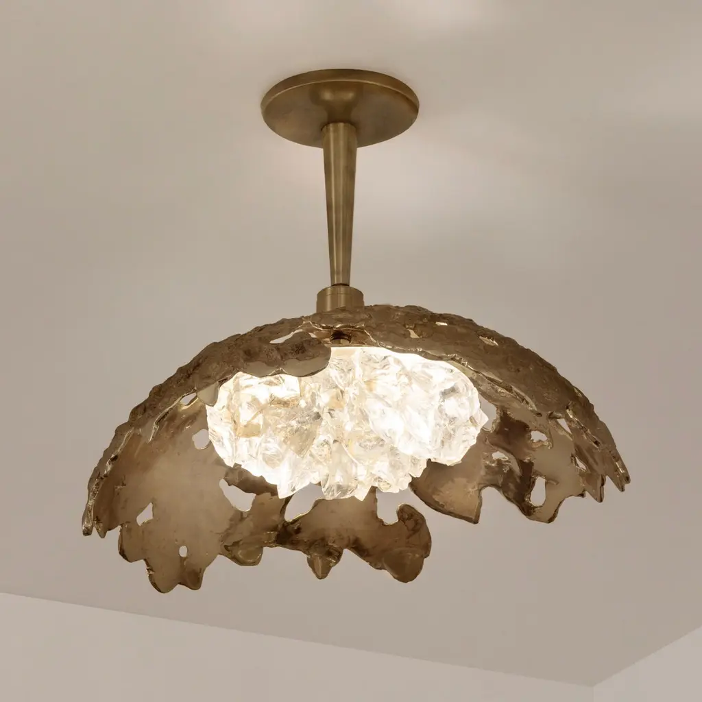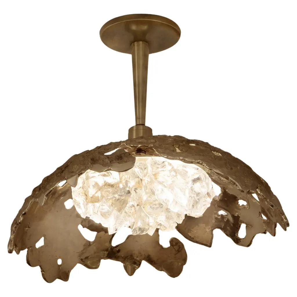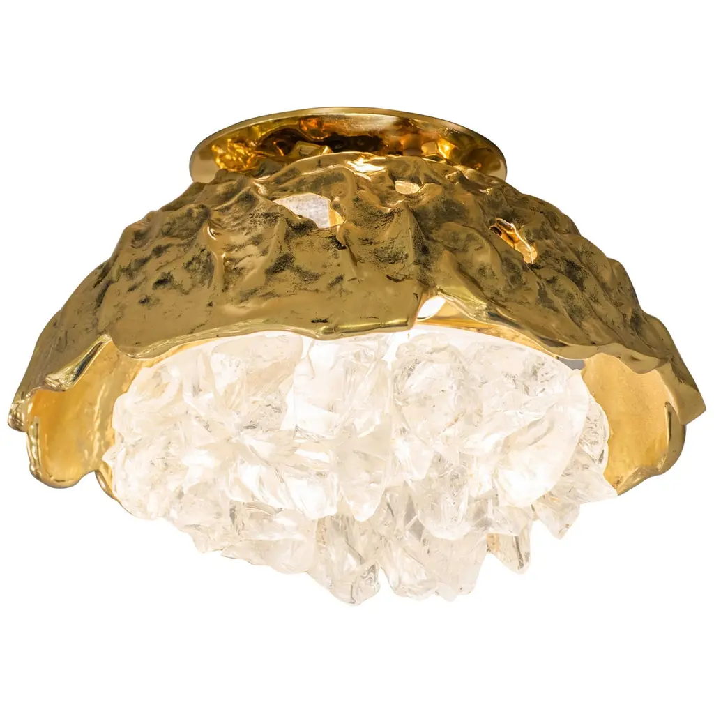 Blending sculpture and design, the N.15 is the intermediate fixture of the Etna series with a glass shade composed of dozens of crystal elements. The organic cast brass shell culminates in a polished stem and canopy. The first images show the fixture in our polished brass finish-subsequent pictures show it in a selection of alternative finishes. Starting at $ 4,900 for standard finishes.Starting at $ 5,300 for premium finishes.Customization Options:Each fixture is hand crafted in Italy and is available any of our 10 finishes and 8 enamel colors. Can be installed as pendant on a stem, a flush mount or wall light. Compatible with our Tuscan crystal.Lead Time: 10-12 weeks plus shippingDiameter: 15”Height: 14”. Overall height can be adjusted as needed.Electrical: Two E12 40W incandescent or 75W LED equivalentModel#: LTZ490