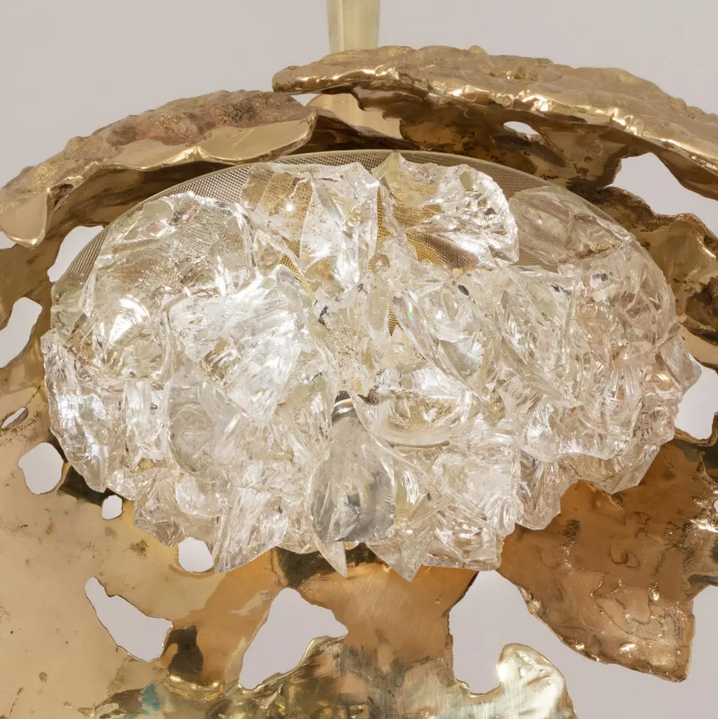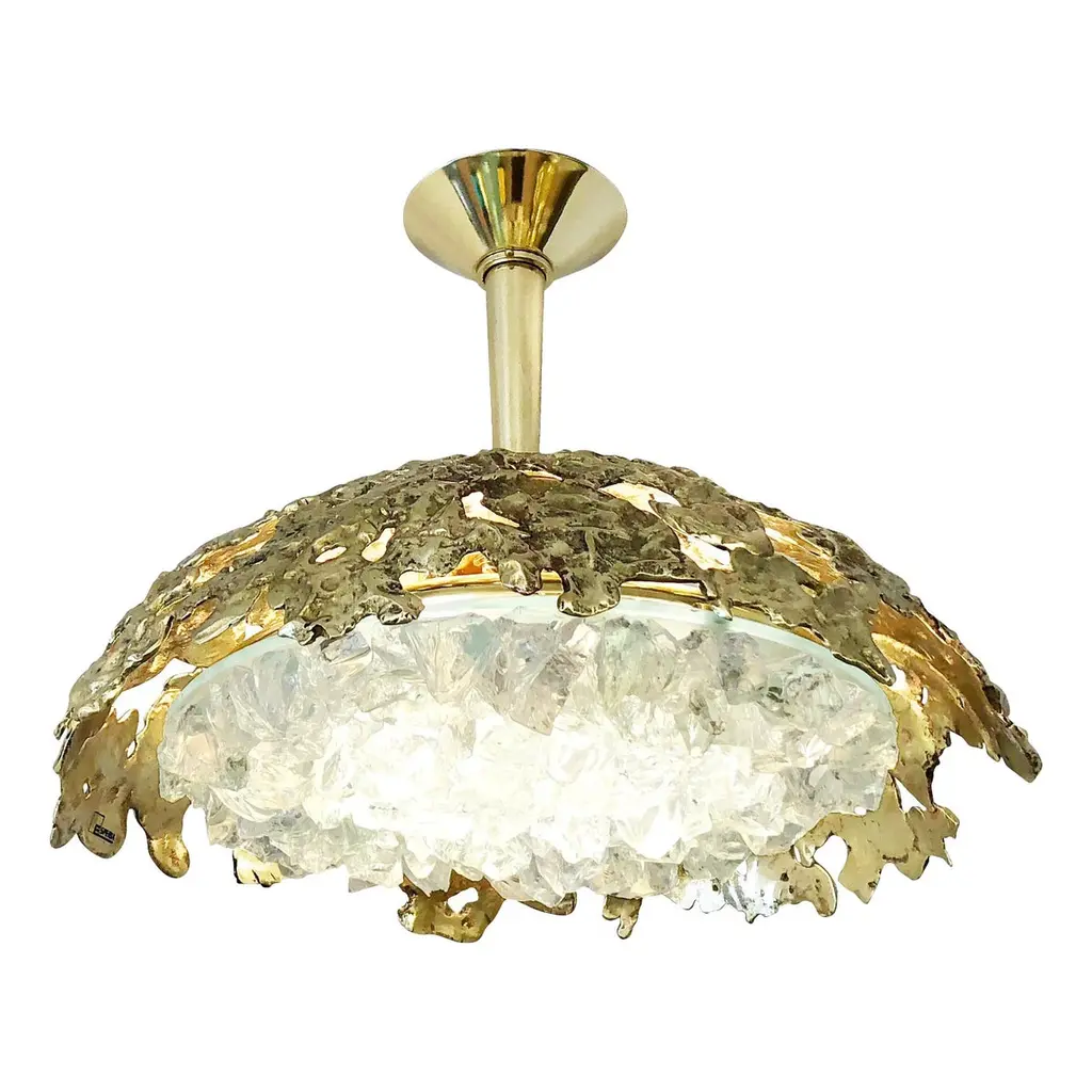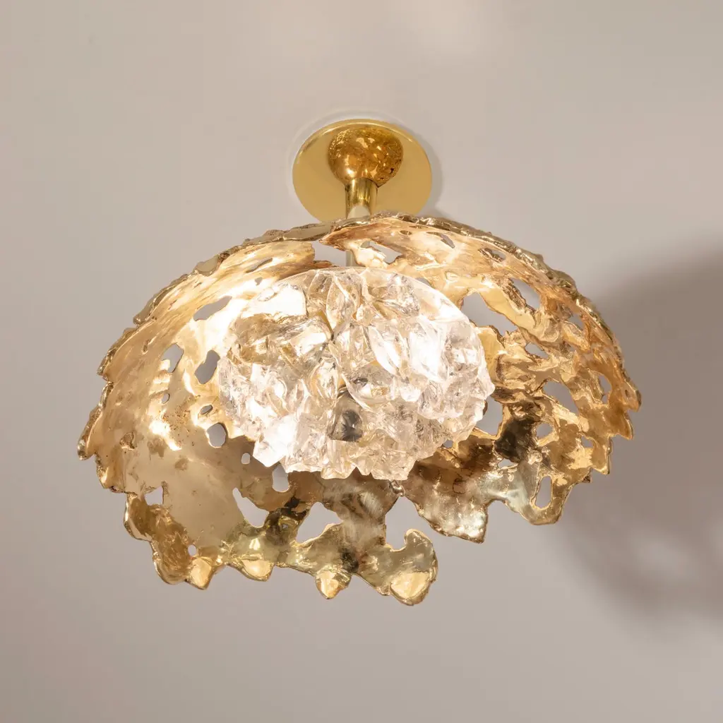 Blending sculpture and design, the N.15 is the intermediate fixture of the Etna series with a glass shade composed of dozens of crystal elements. The organic cast brass shell culminates in a polished stem and canopy. The first images show the fixture in our polished brass finish-subsequent pictures show it in a selection of alternative finishes. Starting at $ 4,900 for standard finishes.Starting at $ 5,300 for premium finishes.Customization Options:Each fixture is hand crafted in Italy and is available any of our 10 finishes and 8 enamel colors. Can be installed as pendant on a stem, a flush mount or wall light. Compatible with our Tuscan crystal.Lead Time: 10-12 weeks plus shippingDiameter: 15”Height: 14”. Overall height can be adjusted as needed.Electrical: Two E12 40W incandescent or 75W LED equivalentModel#: LTZ490