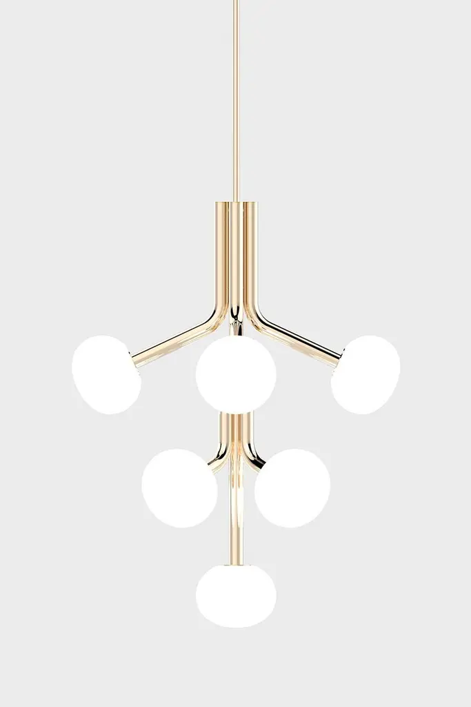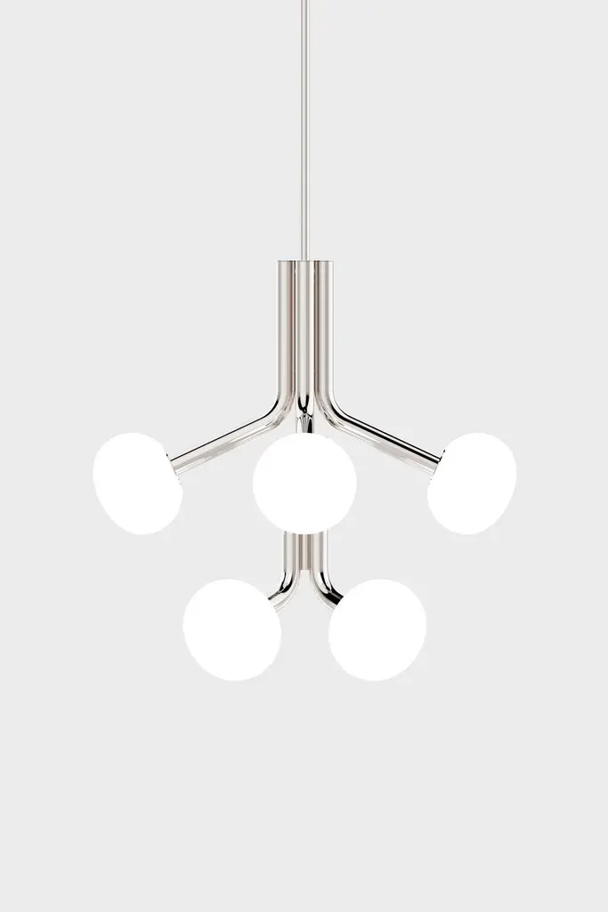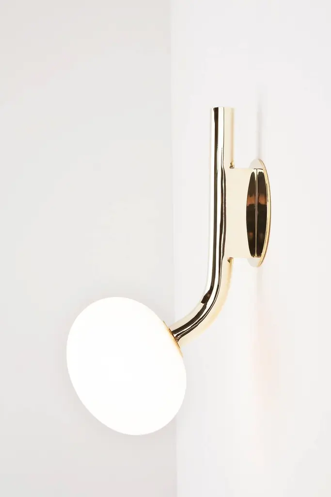 The graceful Etoile sconce is composed of a single curved limb providing a soft glow from the sand blasted, handblown glass shade. The backplate and stem are finished in both polished or satin brass, nickel and copper. The drop, and stems are finished in both polished or satin brass, chrome, polished nickel or copper.
