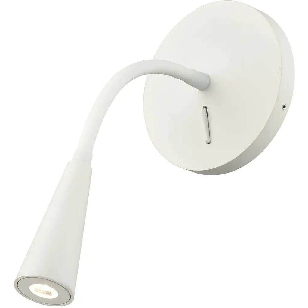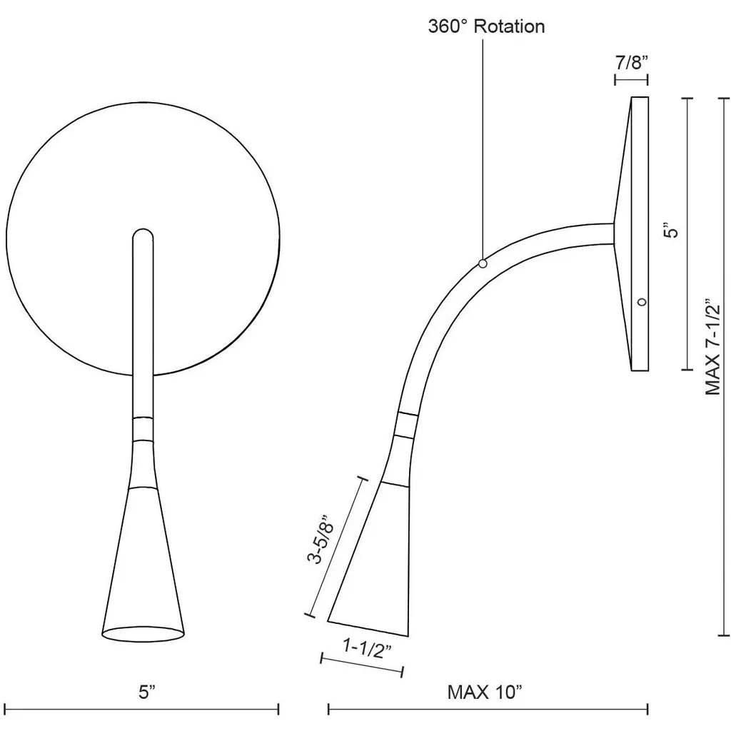 Die-cast aluminum lamp head with flexible rubberized stem. Circular wall mount attachment. Finely textured powder-coated finish. Adjustable direction spot light. Rocker on/off switch.